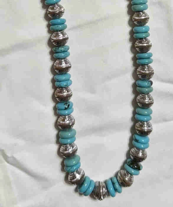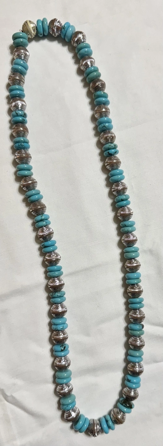 Handmade vintage turquoise beaded necklace featuring silver accent beads.
