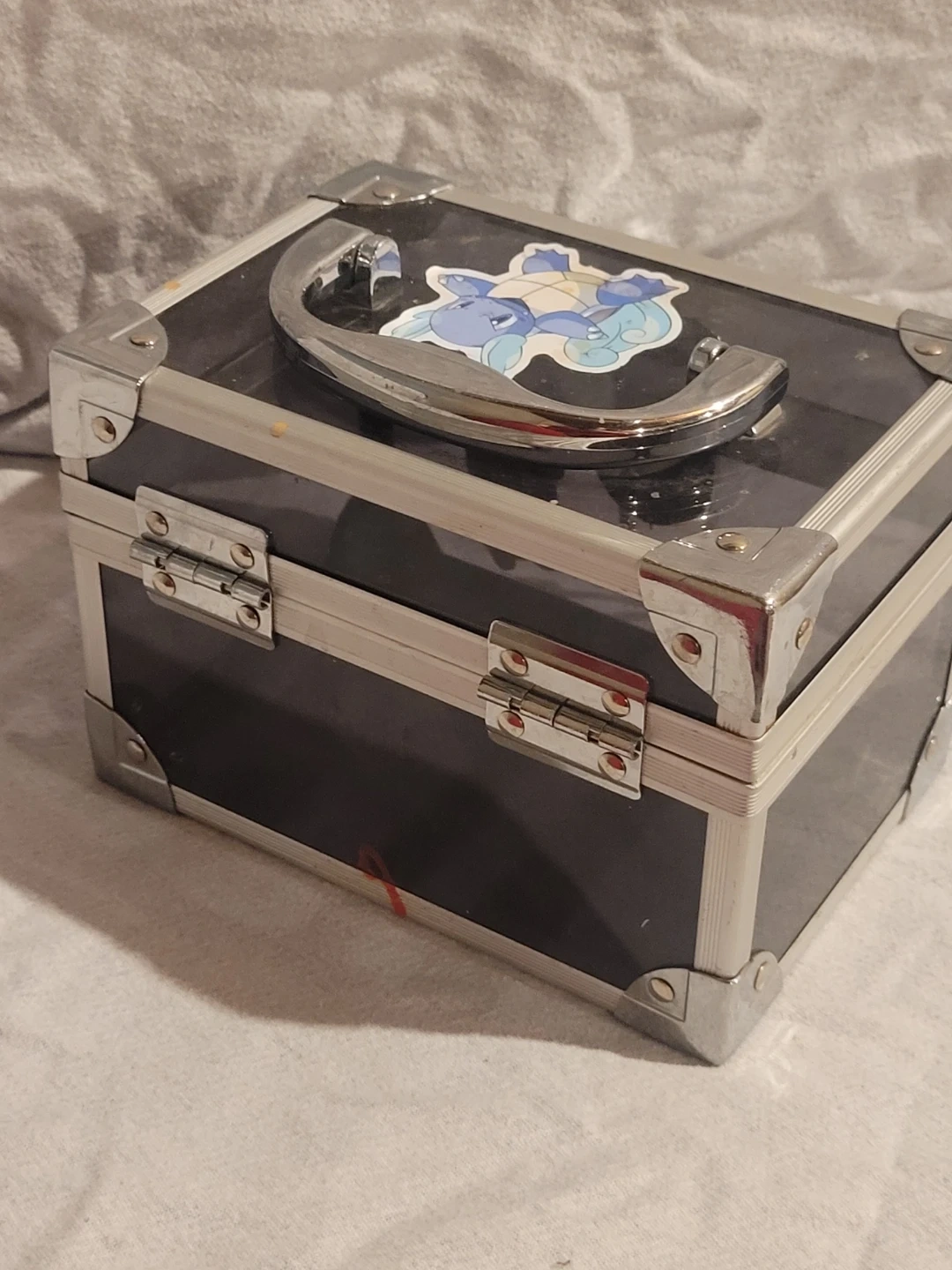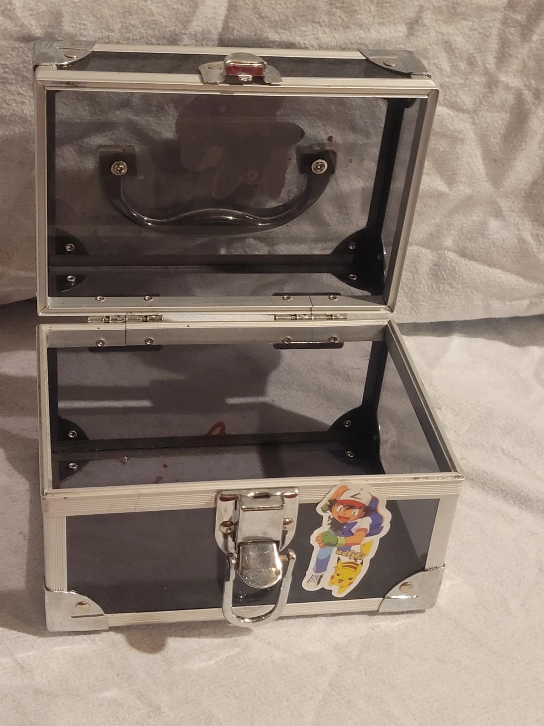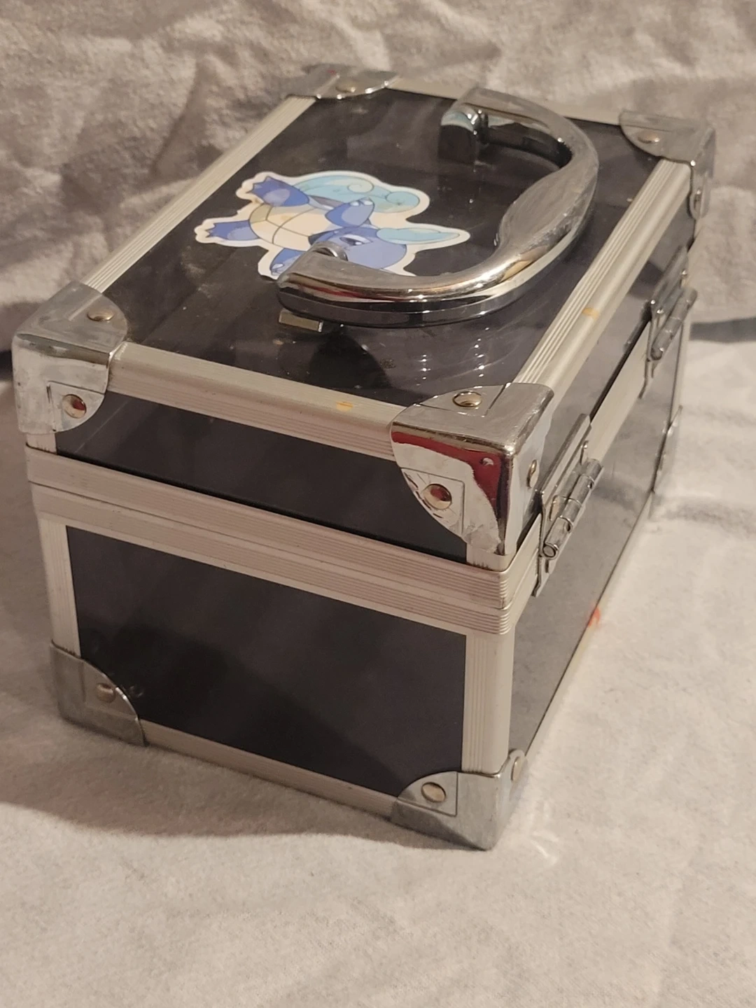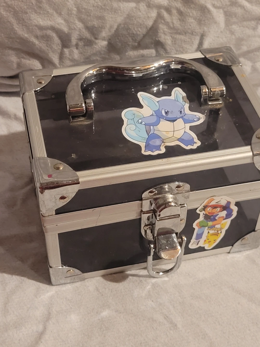 This is a black box with silver hardware and a handle on top, adorned with some fun Pokémon stickers, giving it a unique and playful look! It's in fair condition, showing some signs of use. Perfect for storing small items or as a quirky decorative piece.