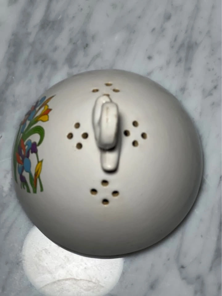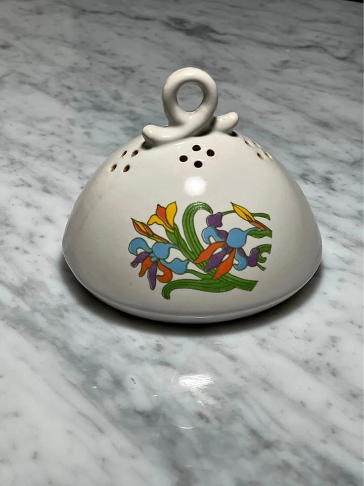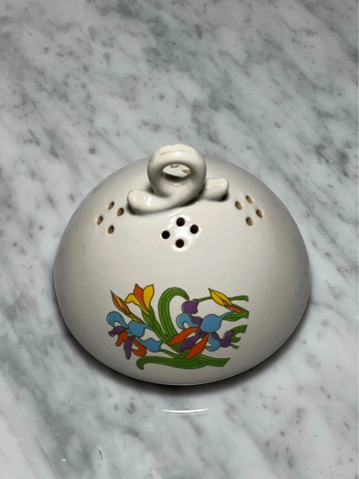 This is a vintage Tabu Dana Perfumes ceramic dusting powder jar lid with a floral design. It features a colorful iris pattern. The lid has several small holes, likely for dusting powder or as a potpourri/sachet pomander. It is a discontinued piece. The material is ceramic or earthenware. Preowned Pickup is 58th and 7th ave in midtown Manhattan