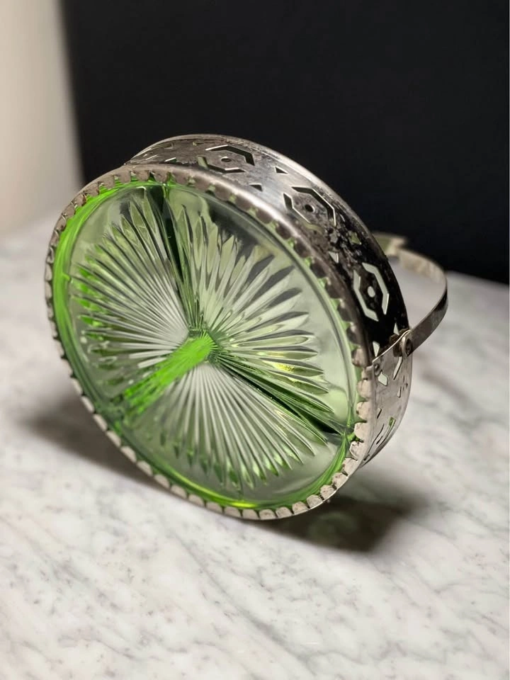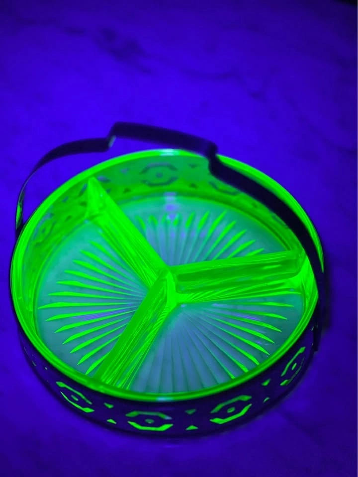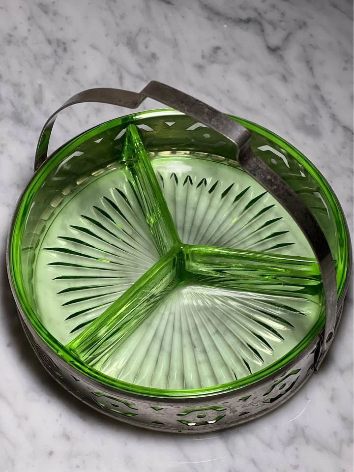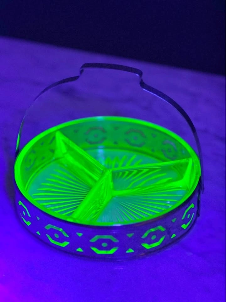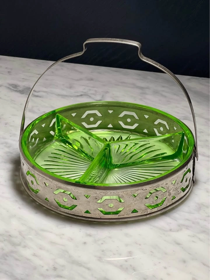 This is a vintage uranium glass dish in a metal basket. The dish is collectible glassware that contains a small amount of uranium oxide, which causes it to glow a vibrant fluorescent green under ultraviolet light.