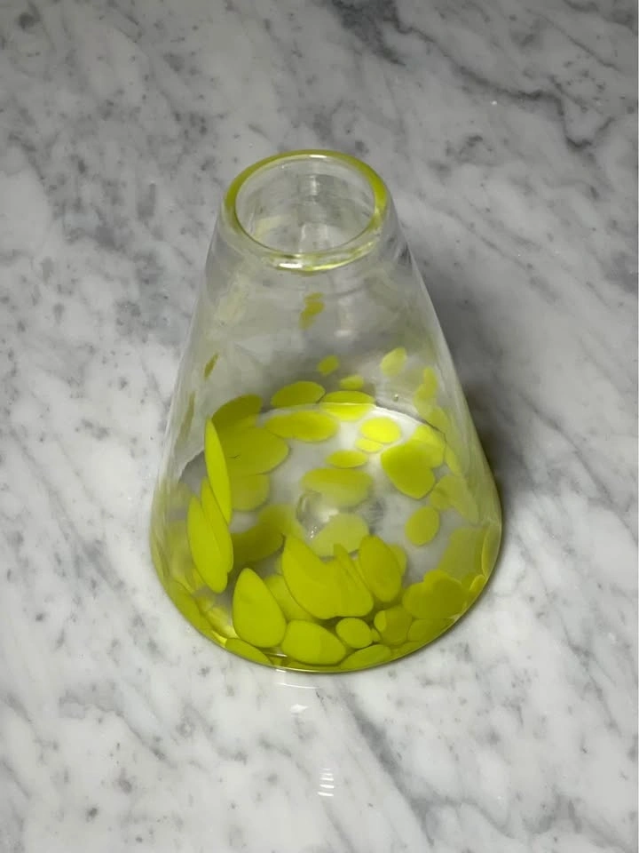 Design: Conical shape, sometimes referred to as a bud or small flower vase, featuring varied, irregularly shaped spots applied during the blowing process