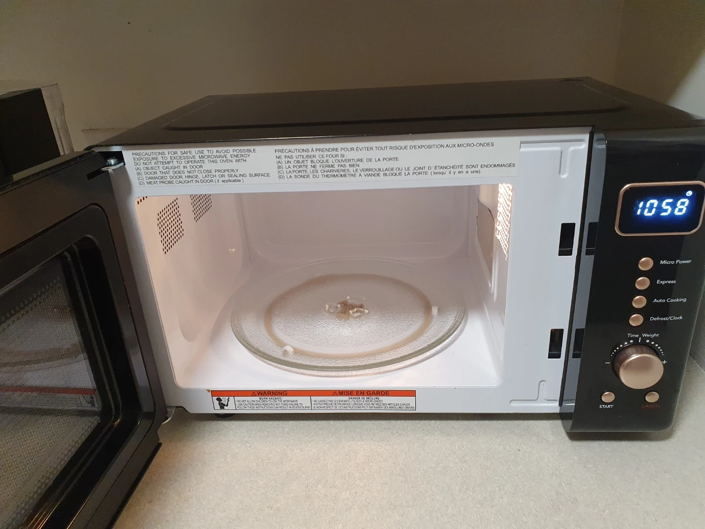 Looking to add a touch of retro charm to your kitchen? This Frigidaire microwave is in great shape and features a stylish black and copper colour scheme. It's perfect for reheating or cooking a quick meal!