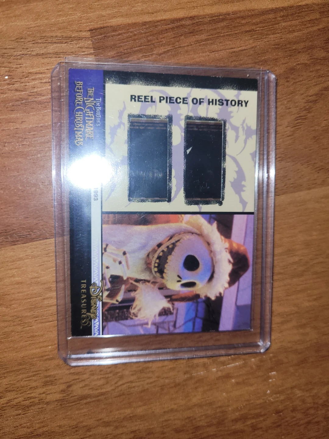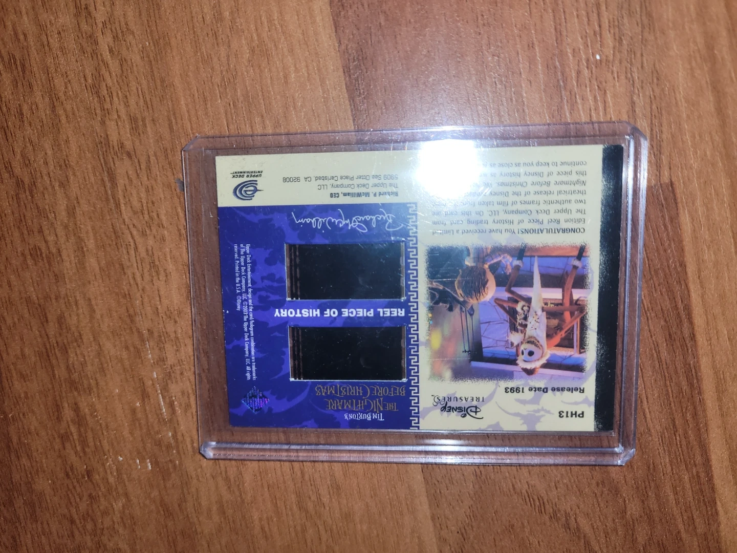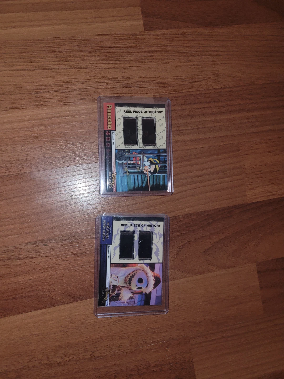 I'm offering two used Disney Treasures Reel Piece of History trading cards, each featuring a genuine piece of a vintage Disney film. One card features "The Nightmare Before Christmas" (PH13, Release Date 1993), and the other features "Pinocchio" (PH20, Release Date 1940), both sealed in protective cases. Please note that these cards are used and may show signs of wear consistent with their age.
