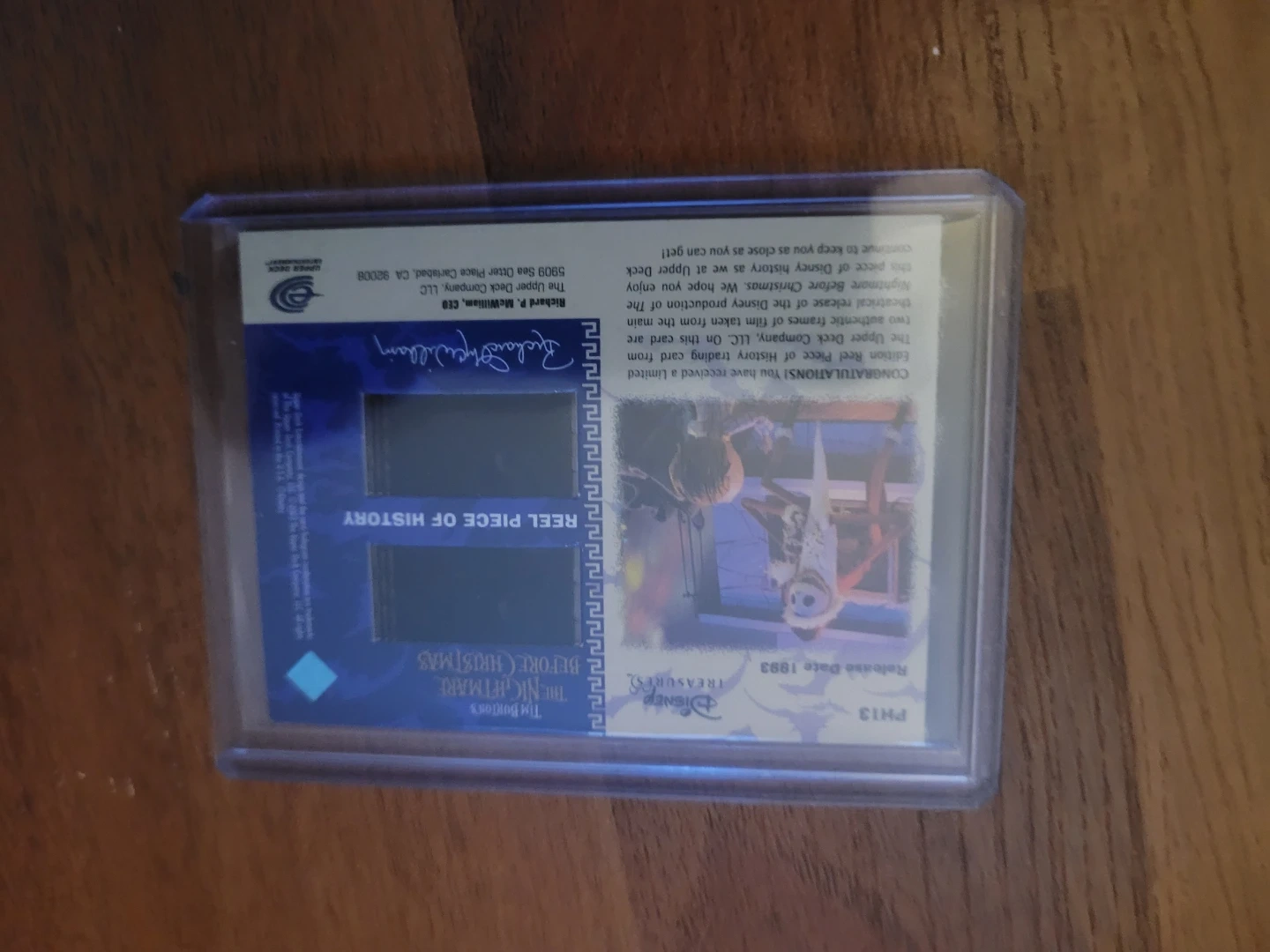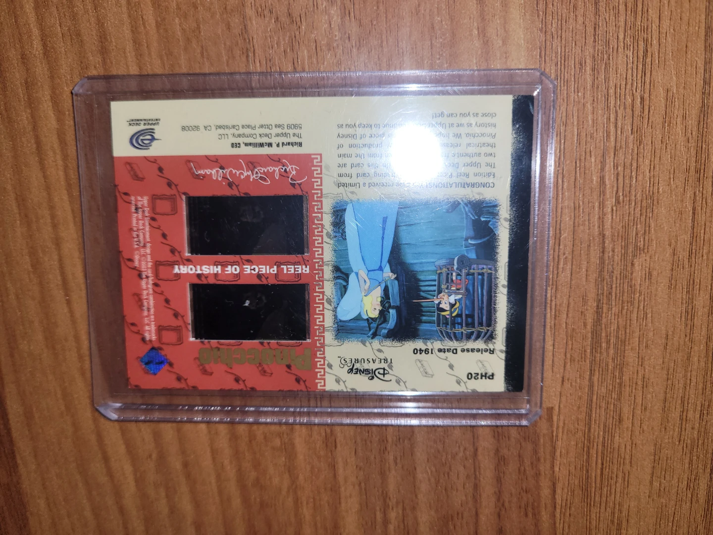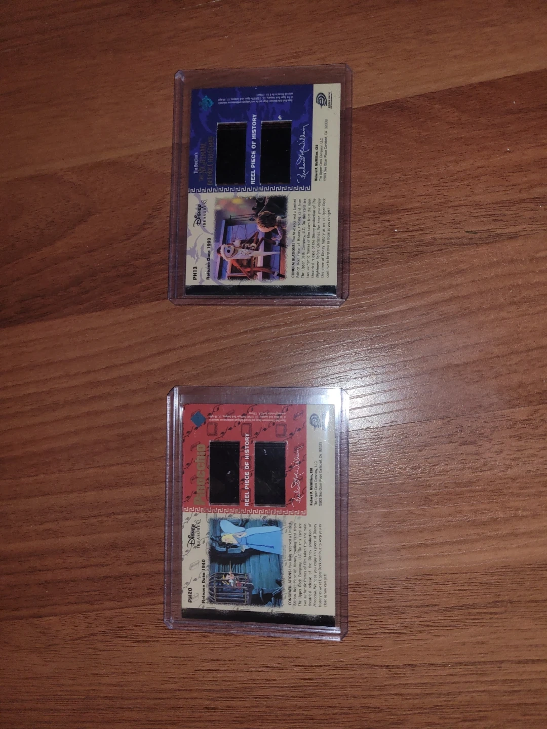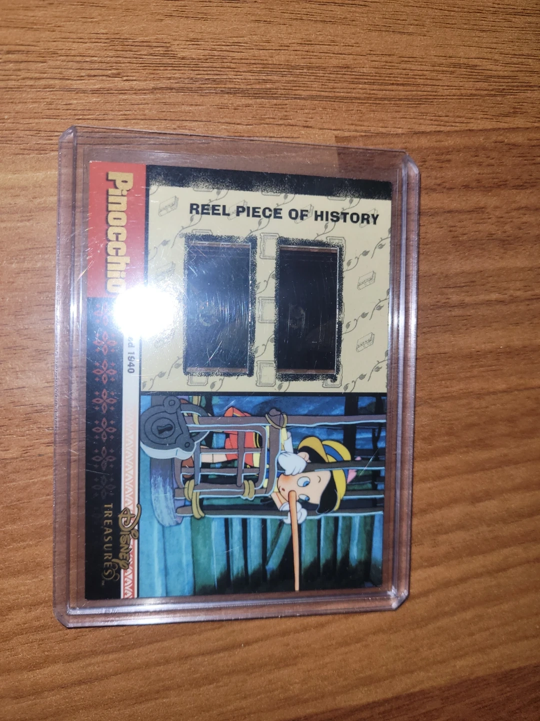 I'm offering two used Disney Treasures Reel Piece of History trading cards, each featuring a genuine piece of a vintage Disney film. One card features "The Nightmare Before Christmas" (PH13, Release Date 1993), and the other features "Pinocchio" (PH20, Release Date 1940), both sealed in protective cases. Please note that these cards are used and may show signs of wear consistent with their age.