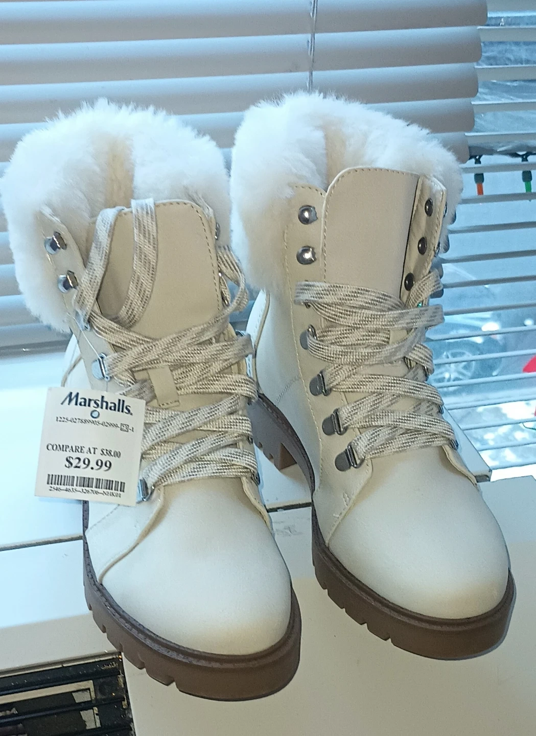 These cream-colored winter boots from Marshalls are super cute! They feature a furry trim and a sturdy sole. The tag shows they were originally compared at $38, but selling for less!