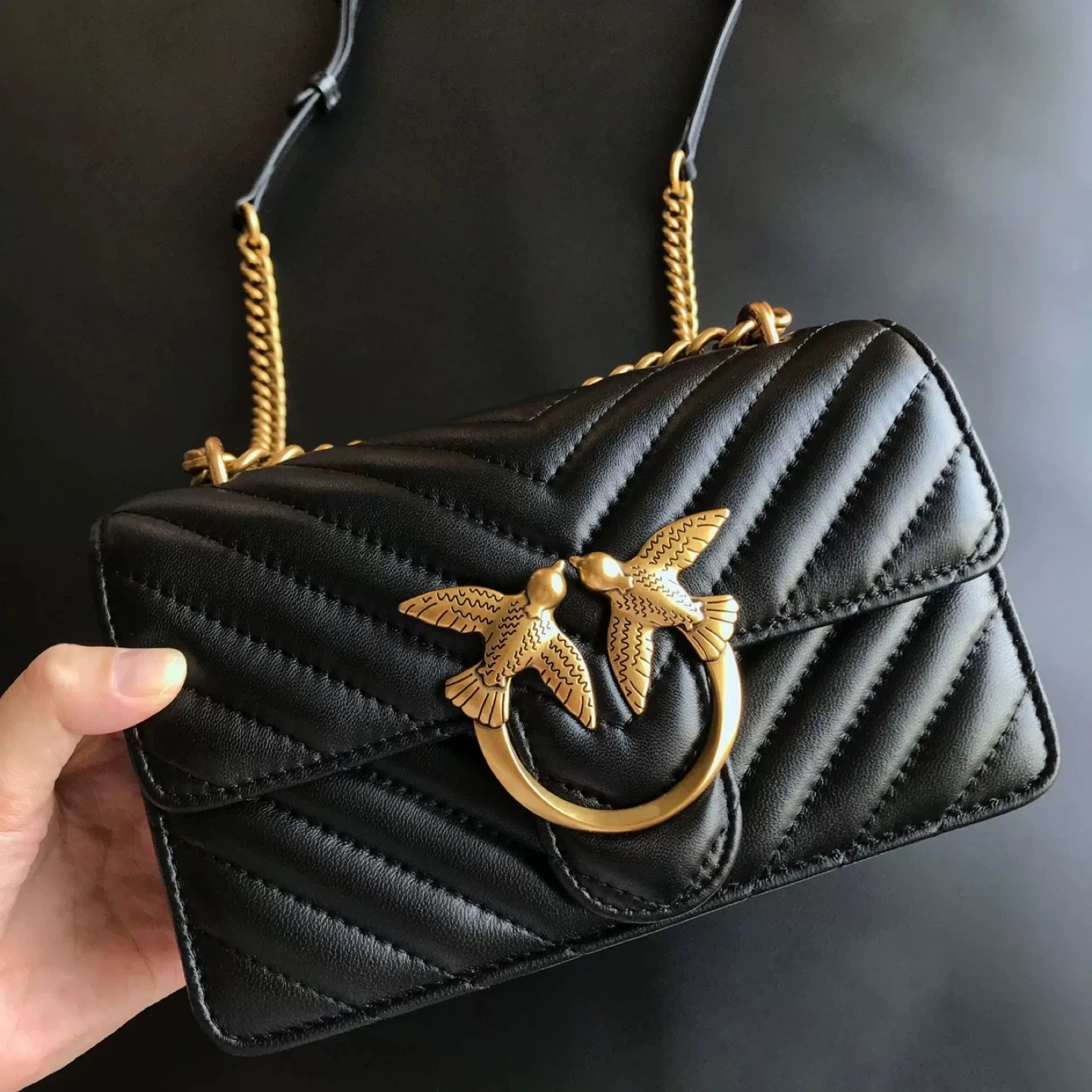 Selling a Pinko Love Baby Puff shoulder bag. It's black with gold hardware and a gold chain strap. The bag is made of quilted leather and features the iconic Pinko bird buckle.