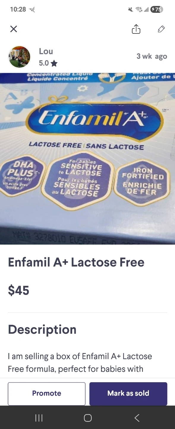 Selling a box of Enfamil A+ Lactose Free formula! It's perfect for babies with lactose sensitivities. It's iron fortified and contains DHA Plus.