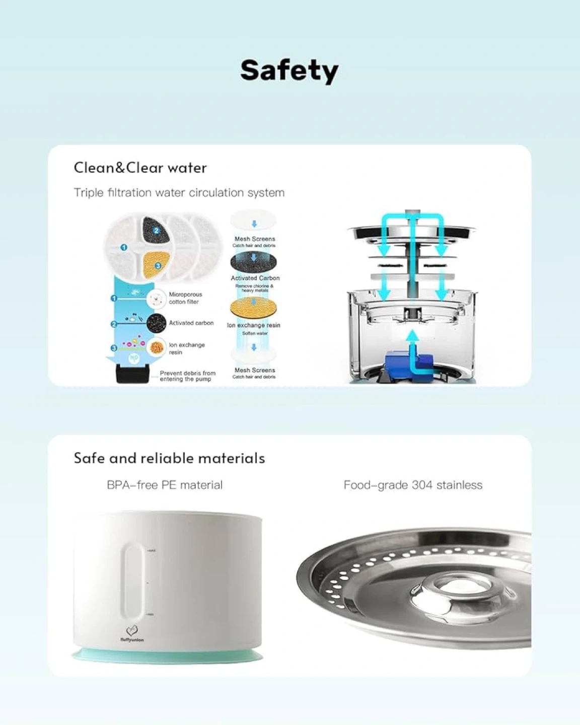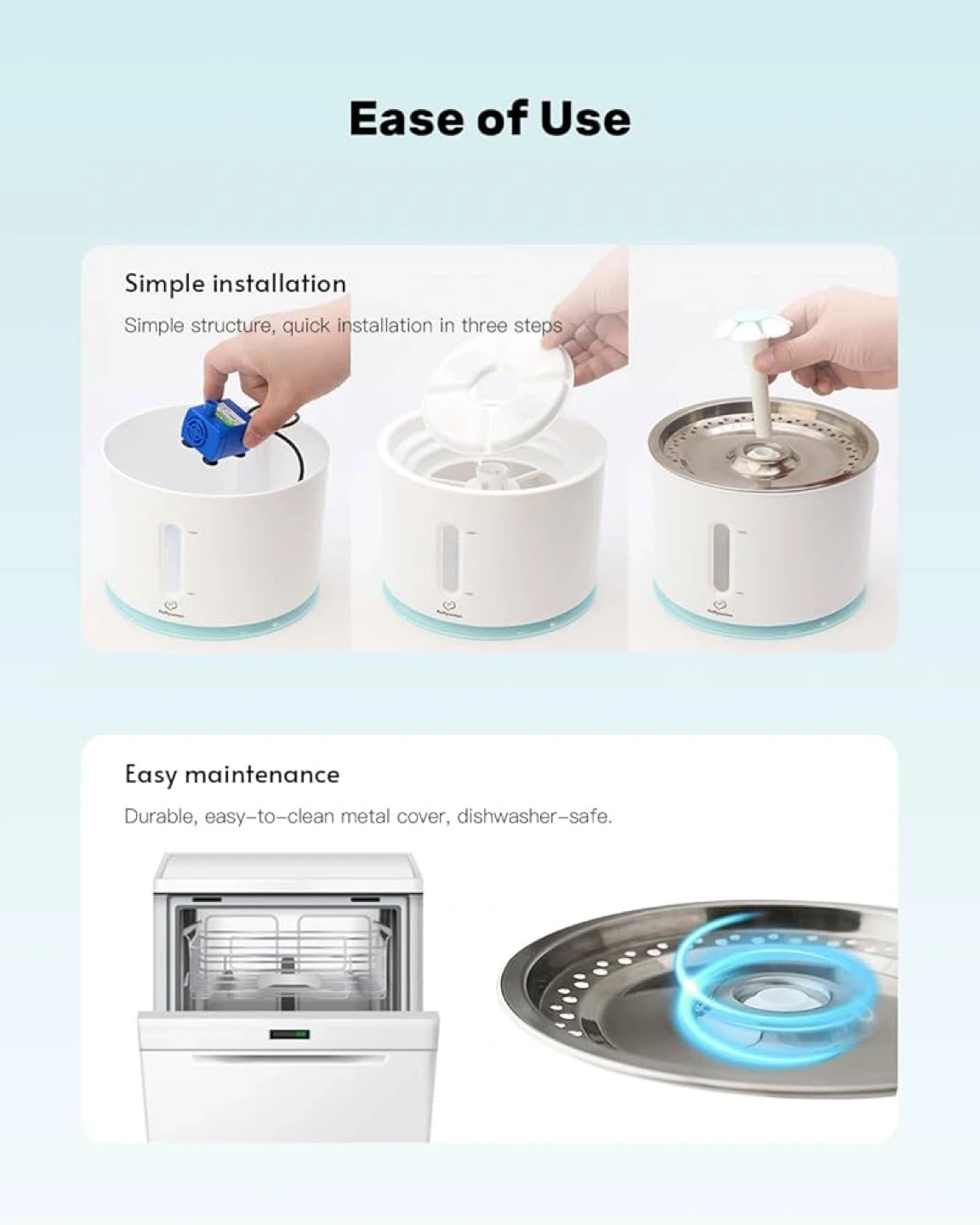 • Hassle-free: the pet fountain only takes a few minutes to set up. Disassembling for cleaning and maintenance is easy. BPA free cat fountain is safe for your pets. Call or email our customer support team in California if you have any questions.