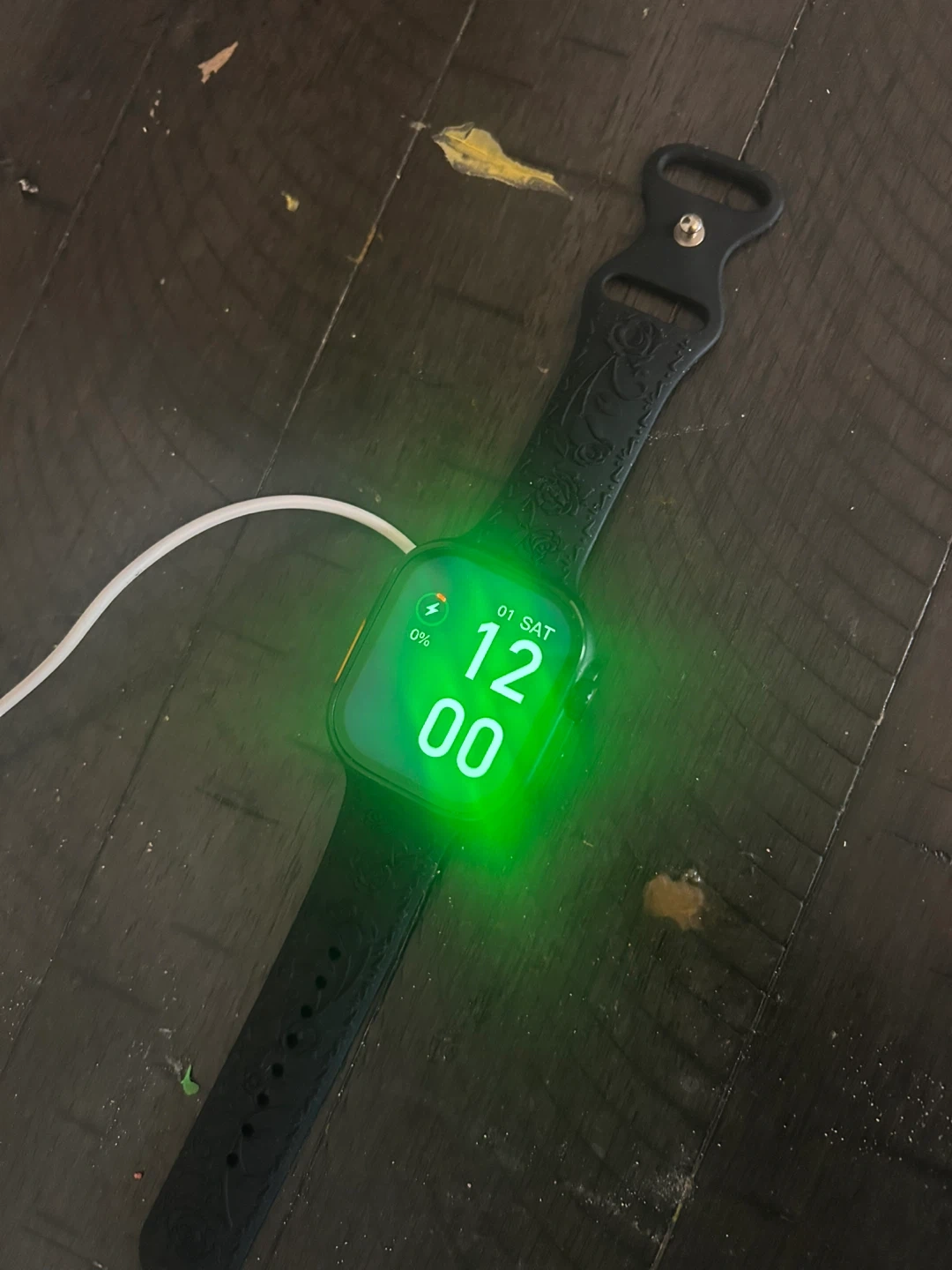 Selling a faux Apple Watch with a black band. The watch is in good condition and comes with a charger. The band has a nice floral design on it. Feel free to reach out if you have any questions!