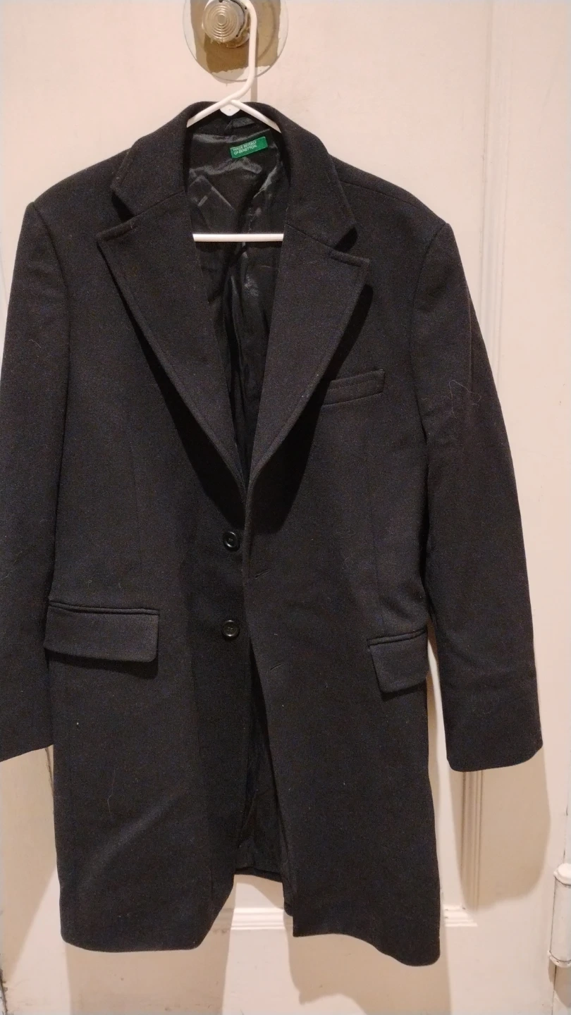 Here's a classic black overcoat from Benetton! It's made of a wool blend, perfect for staying warm and stylish during cooler weather. It's in great condition and ready for a new home in your wardrobe