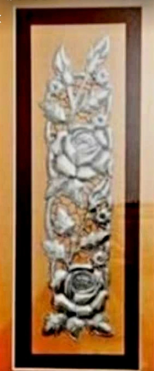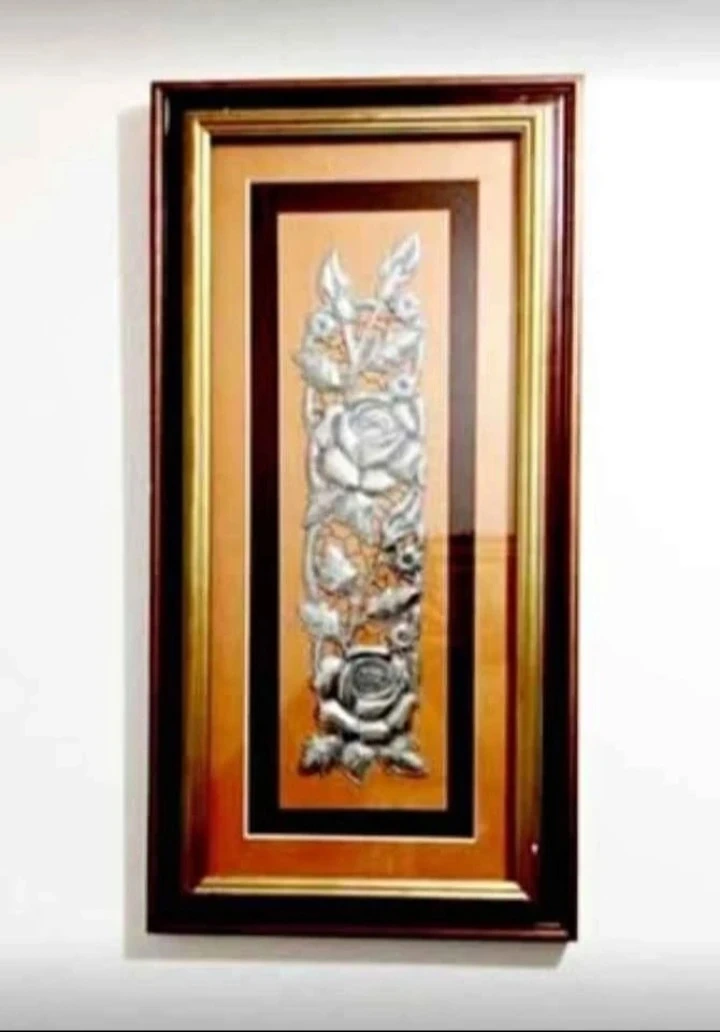 Unique, vintage signed floral Rapujado metal art piece, beautifully framed and ready to adorn your wall! It's a unique find with intricate detailing, showcasing a floral motif in a multi-layered, glass wooden frame.