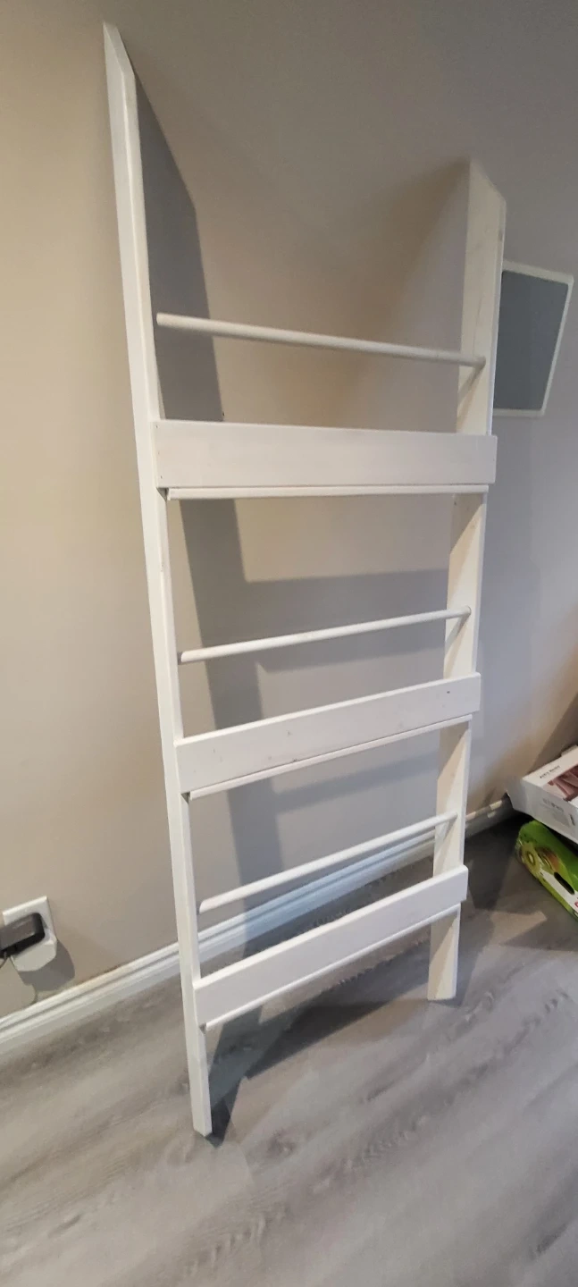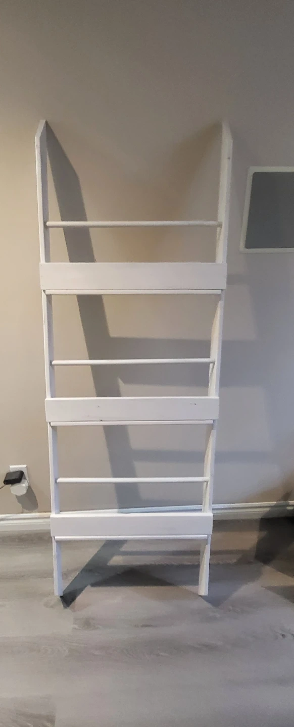 Here's a charming white wooden leaning ladder shelf, perfect for adding a touch of rustic elegance to any room! Needs to be fastened to the wall. Measures 6 feet tall, and 2 feet wide.