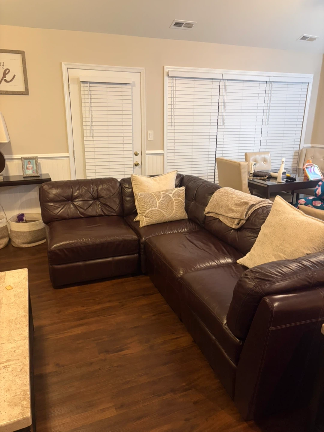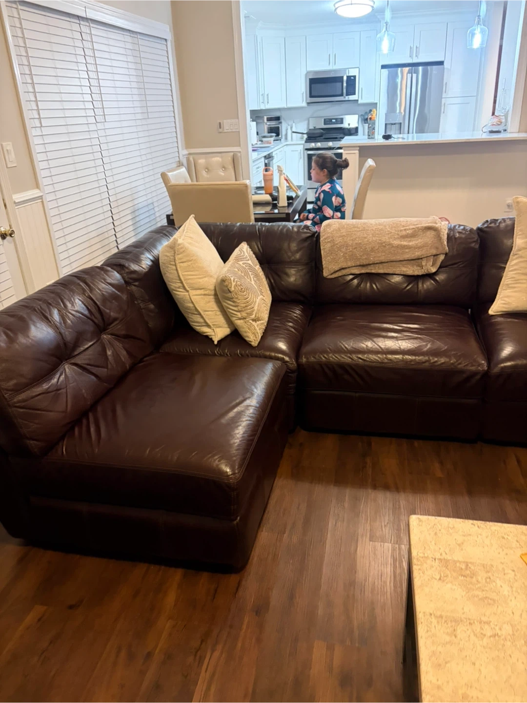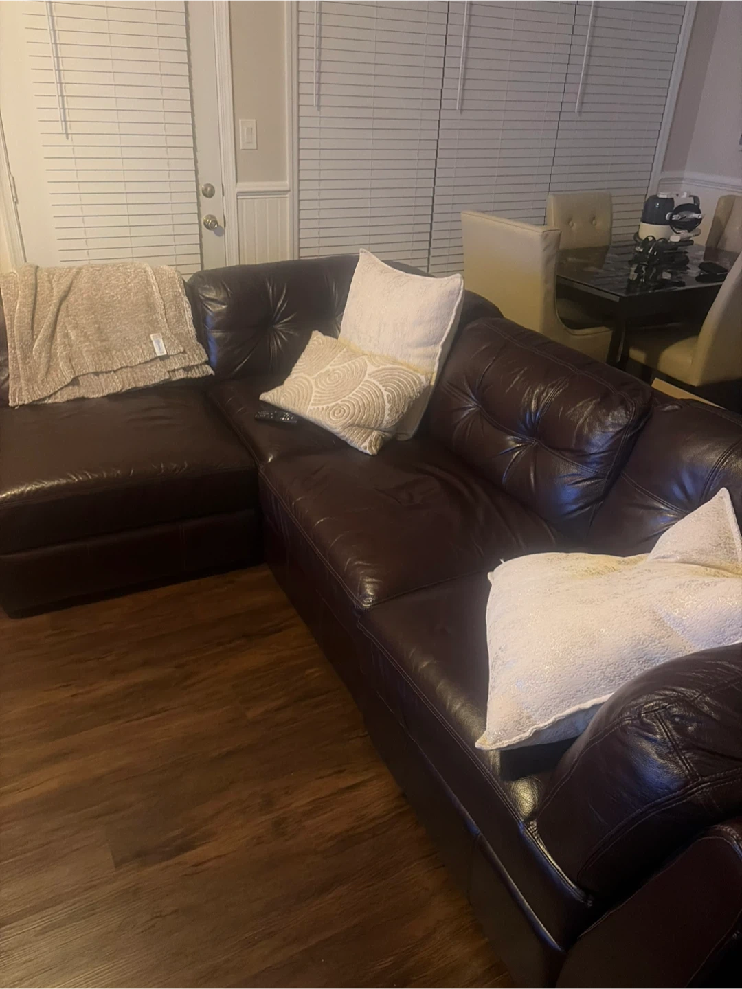 Selling a comfortable brown leather sectional sofa. It's a great piece for any living room and offers plenty of seating space. The leather has a nice, rich color that would complement many decor styles. It's in good condition and ready for a new home!