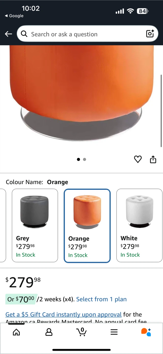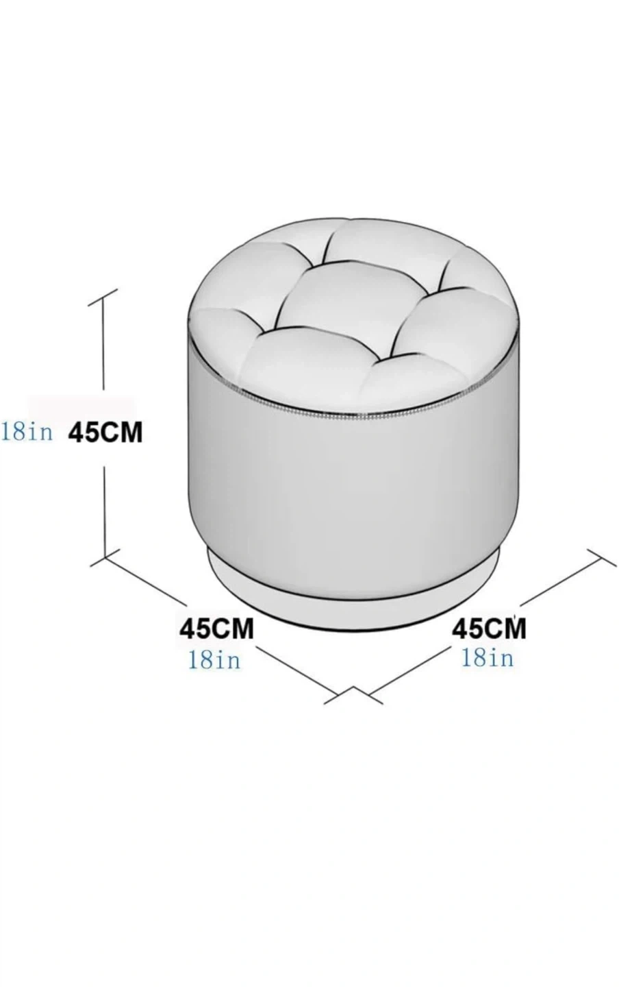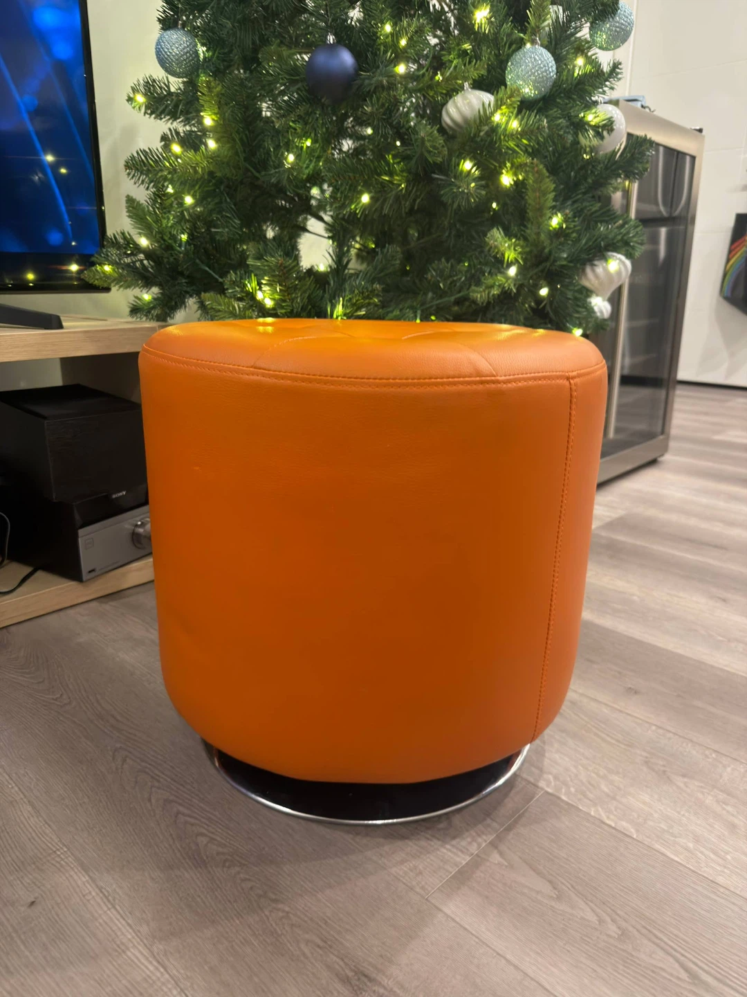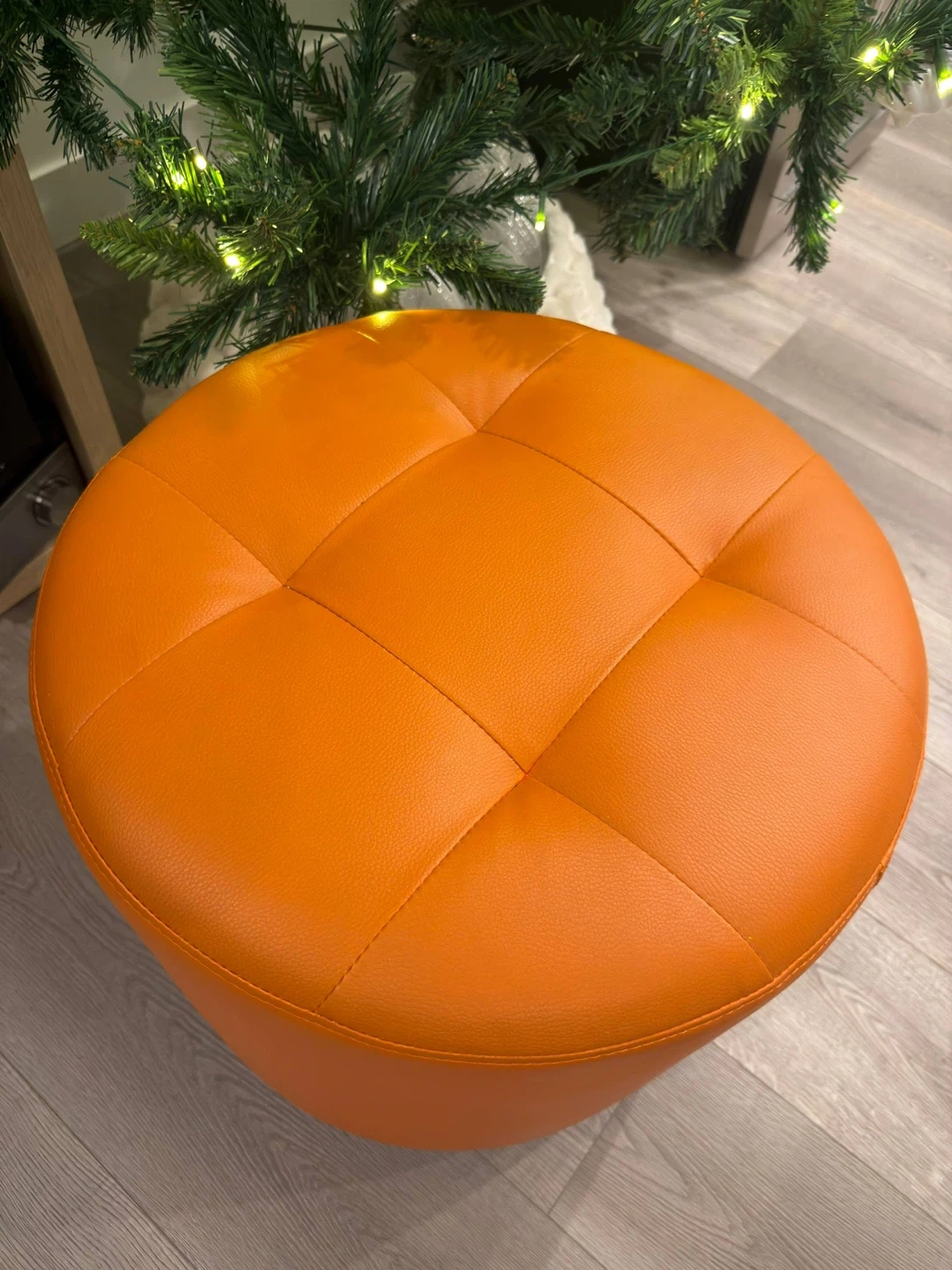 Selling an orange ottoman. It is 18 inches in diameter and height. This ottoman would be a great addition to any living room or bedroom!