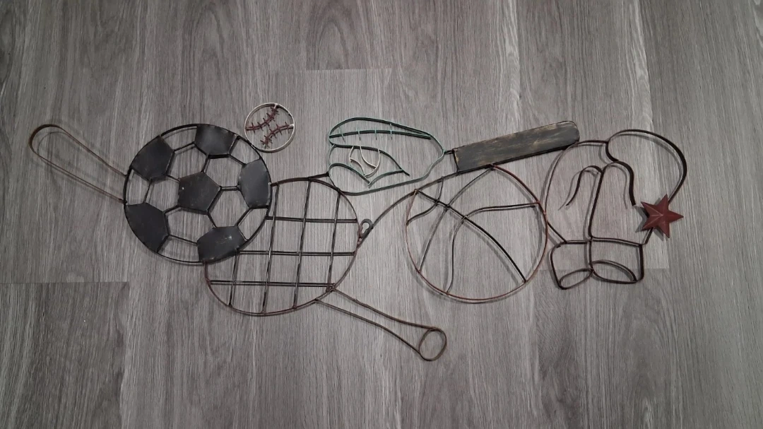 Here's a unique piece of metal wall art featuring various sports equipment outlines like a soccer ball, baseball, tennis racket, basketball, and boxing gloves! It's a great decorative piece for a sports enthusiast's room or any space that needs a sporty touch.