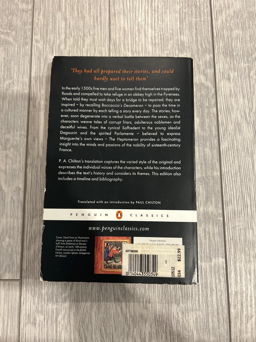 Selling a copy of The Heptameron by Marguerite de Navarre, published as a Penguin Classic. It's a collection of stories set in 16th-century France, translated with an introduction by Paul Chilton. The cover features a detail from an illumination at the Denver Art Museum.