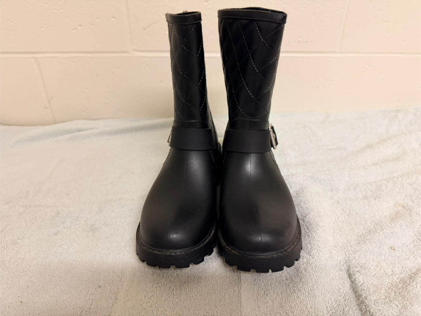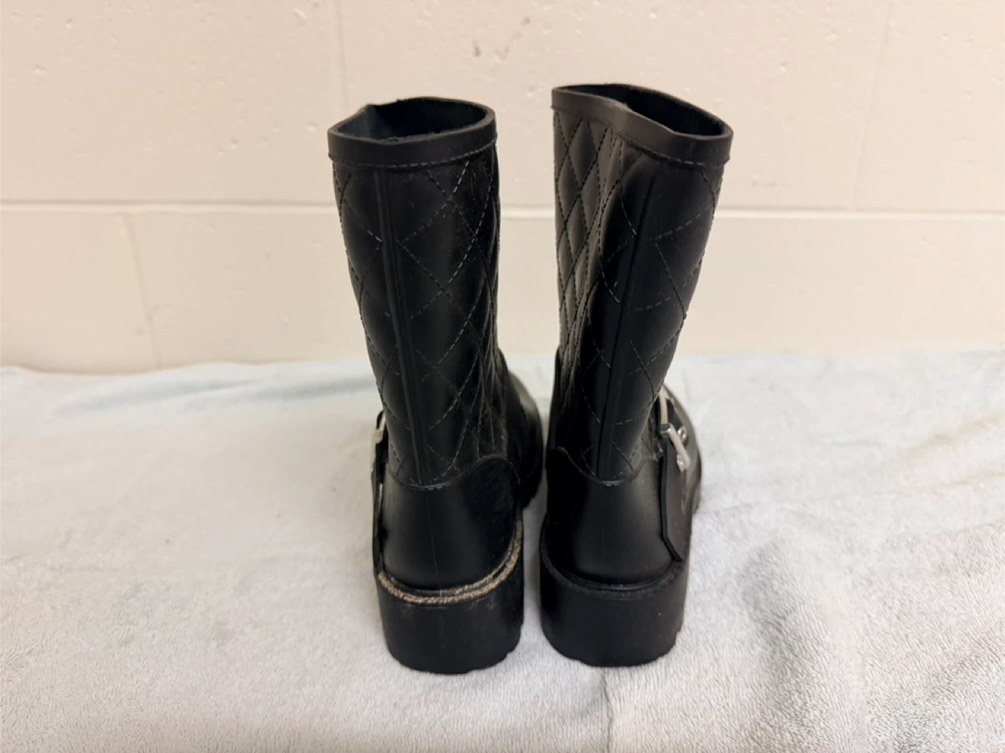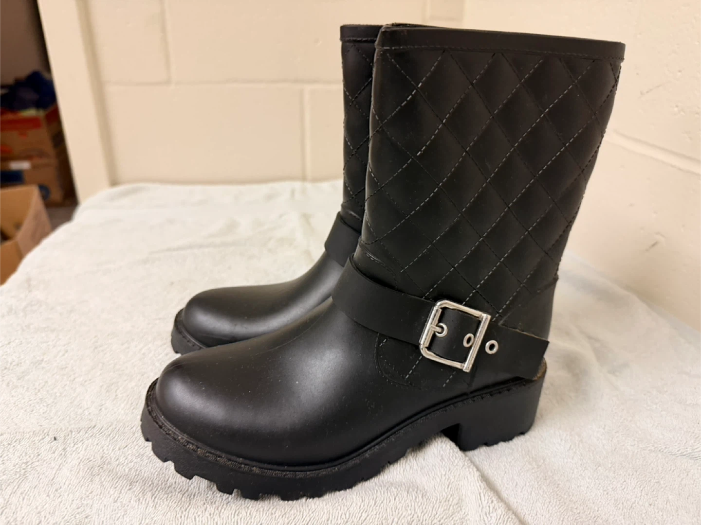 These size 7 black rain boots feature a quilted design and a buckle detail. They're perfect for keeping your feet dry and stylish on rainy days!