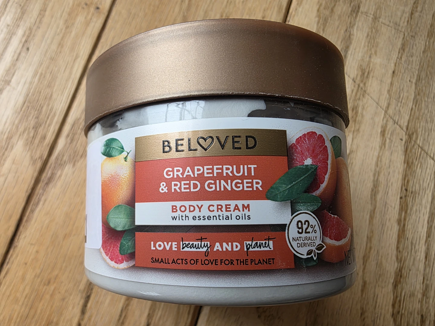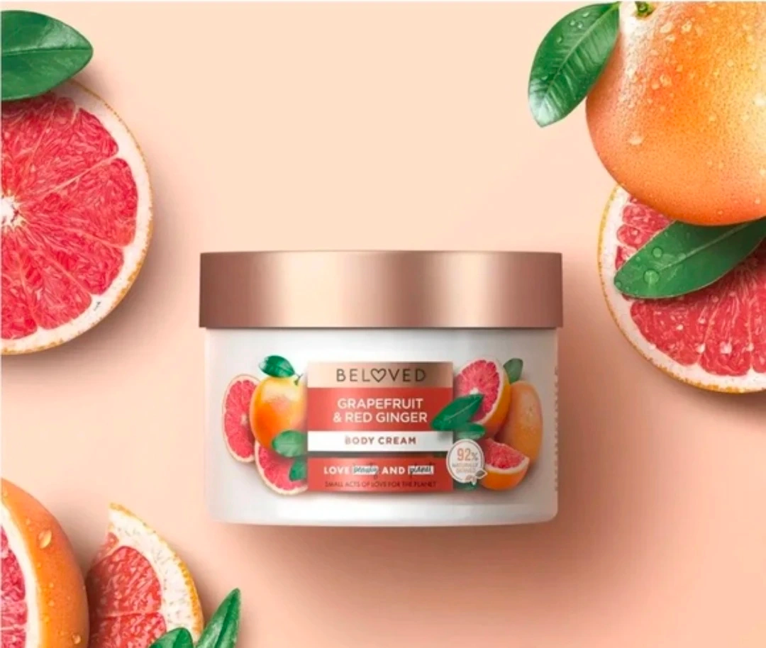 I'm selling a jar of Beloved Grapefruit & Red Ginger Body Cream. It's made with essential oils and is 92% naturally derived. This cream is part of the Love Beauty and Planet line, focusing on small acts of love for the planet. Perfect for moisturizing your skin with a refreshing scent!