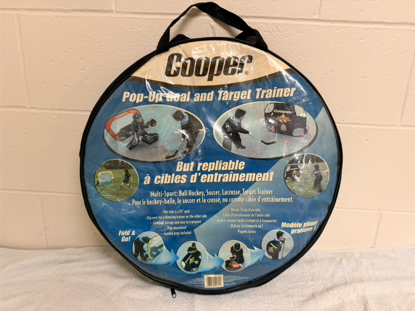 Selling a Cooper Pop-Up Goal and Target Trainer! It's multi-sport, great for ball hockey, soccer, lacrosse, or cross training. It folds flat for easy storage and transport. Ground pegs are included too!