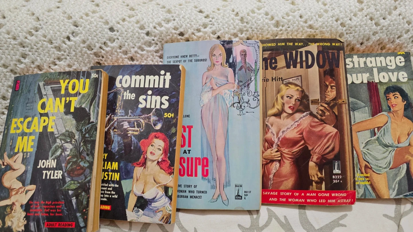 Selling a collection of vintage pulp fiction books. Titles include: You Can't Escape Me by John Tyler, Commit the Sins by William Austin, Lust at Leisure by Lone, The Widow by Erie Hitt, and Strange Our Love. These are adult reading books with eye-catching covers! Only available for pickup.