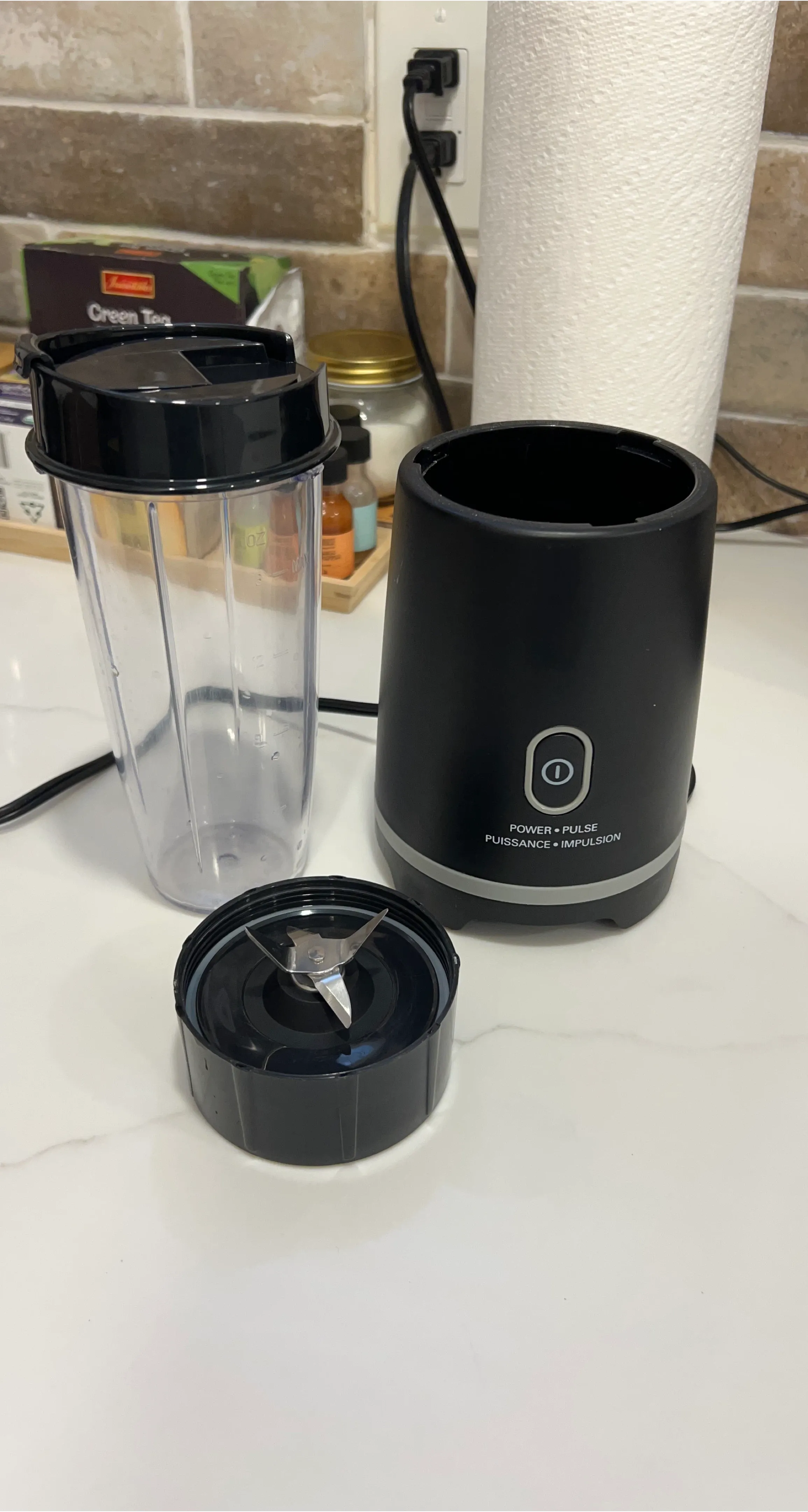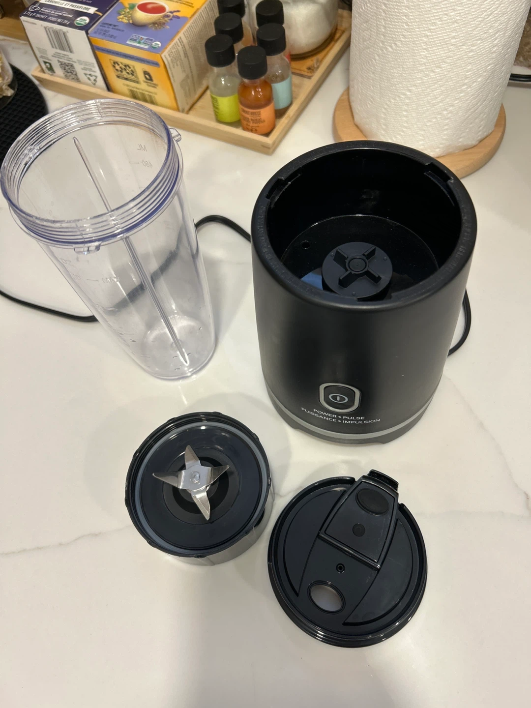 Selling a personal blender in black. It's in great condition and perfect for making smoothies or protein shakes. It includes the blender base, blending cup, and blade attachment