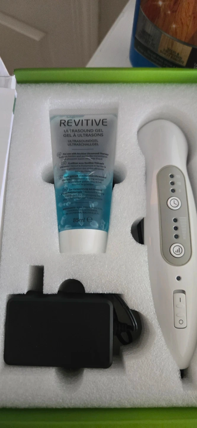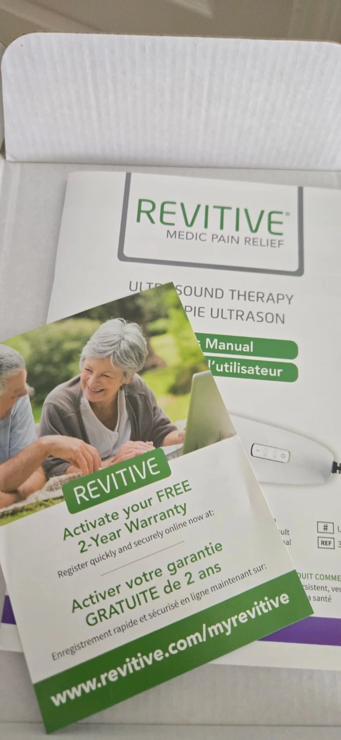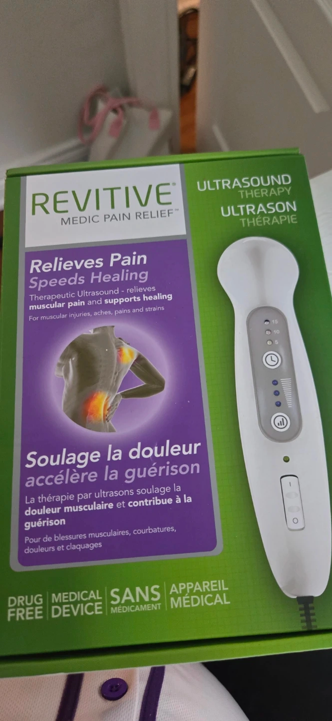 I'm selling a Revitive Medic Pain Relief Ultrasound Therapy device. It's designed to relieve pain and accelerate healing. The box includes the ultrasound gel and all original components