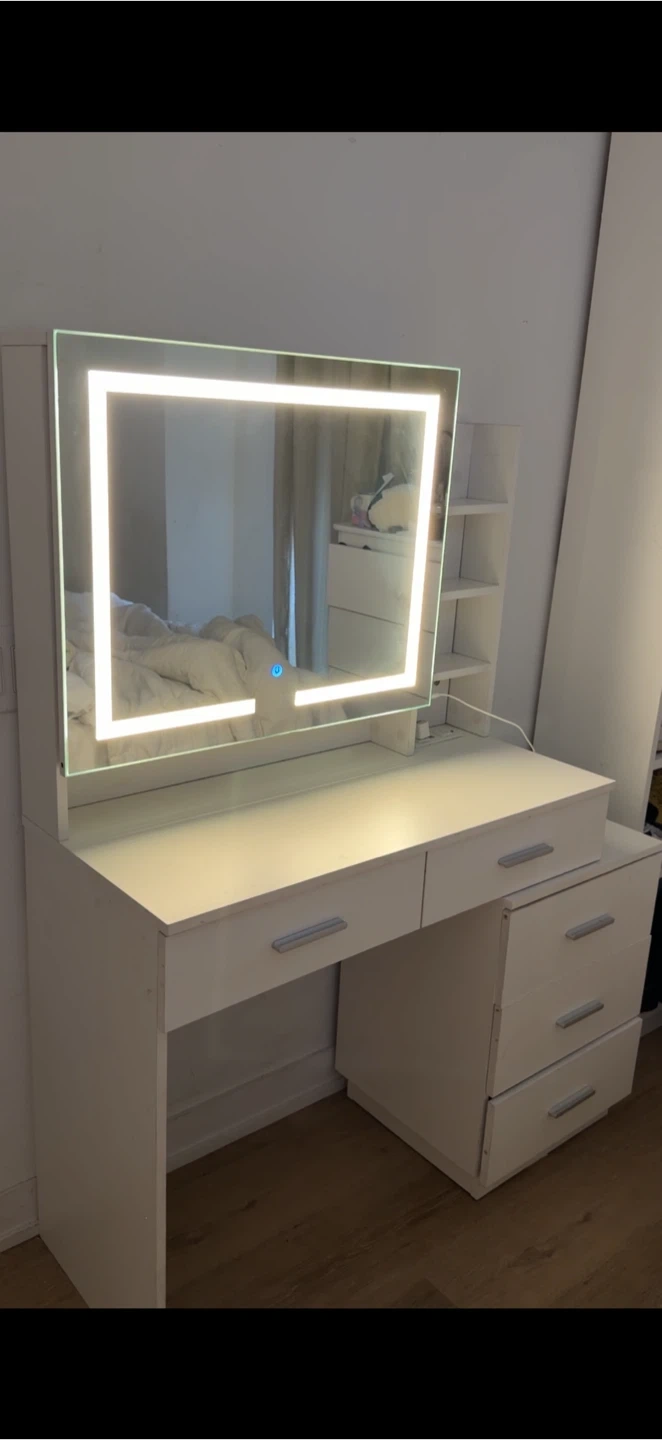 Selling a vanity table in white with a lighted mirror! It has plenty of storage with drawers and shelves for all your beauty products and accessories