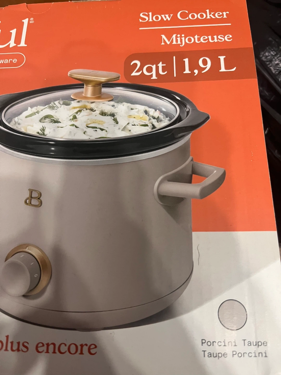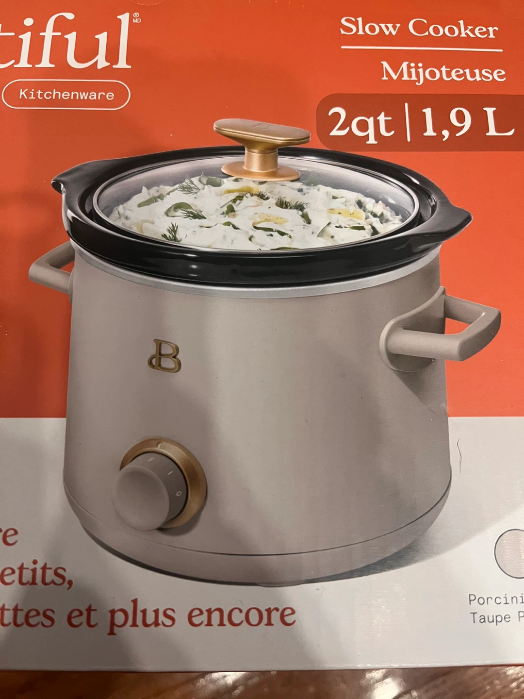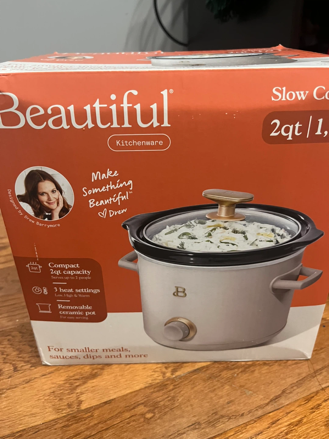 Beautiful by Drew Barrymore 2qt slow cooker for sale! It's in the Porcini Taupe colour and is brand new in the box. It has 3 heat settings and a removable ceramic pot. Perfect for smaller meals!