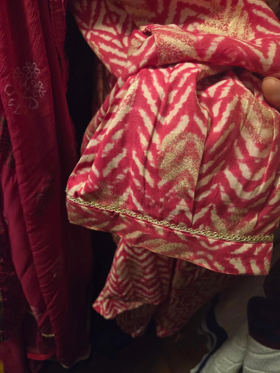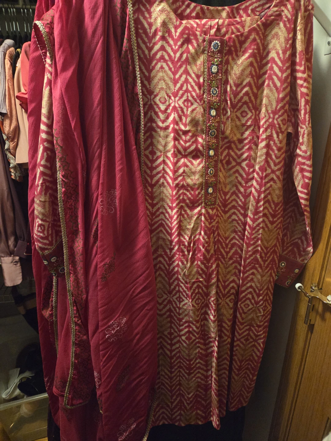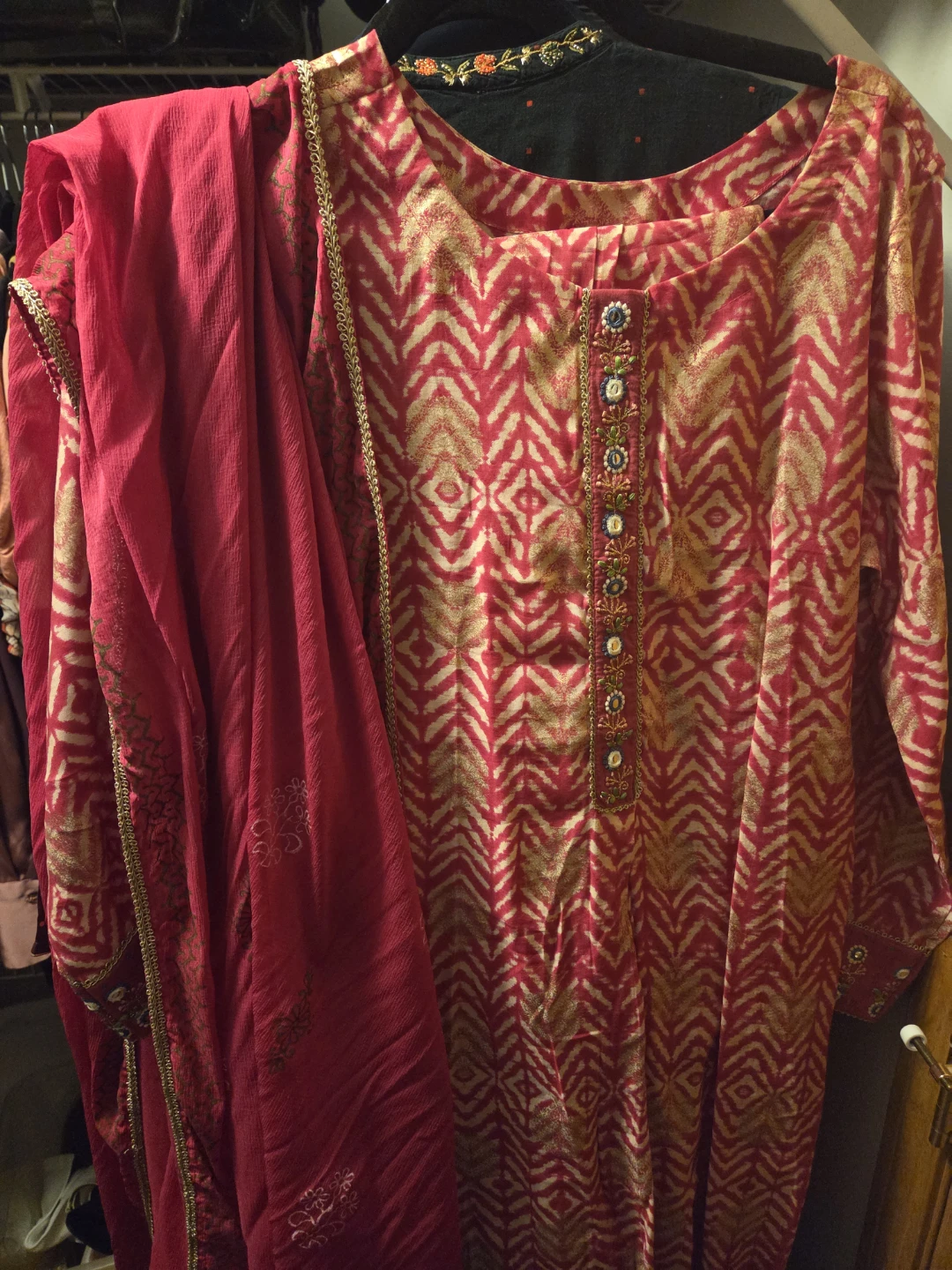 Beautiful salwar kameez in a vibrant pink and gold pattern. Perfect for a special occasion or adding a pop of color to your wardrobe! The fabric drapes nicely and feels comfortable. The intricate detailing along the neckline and hem adds a touch of elegance. Unworn and new. Pickup in Uptown