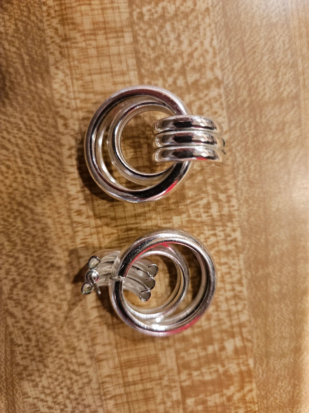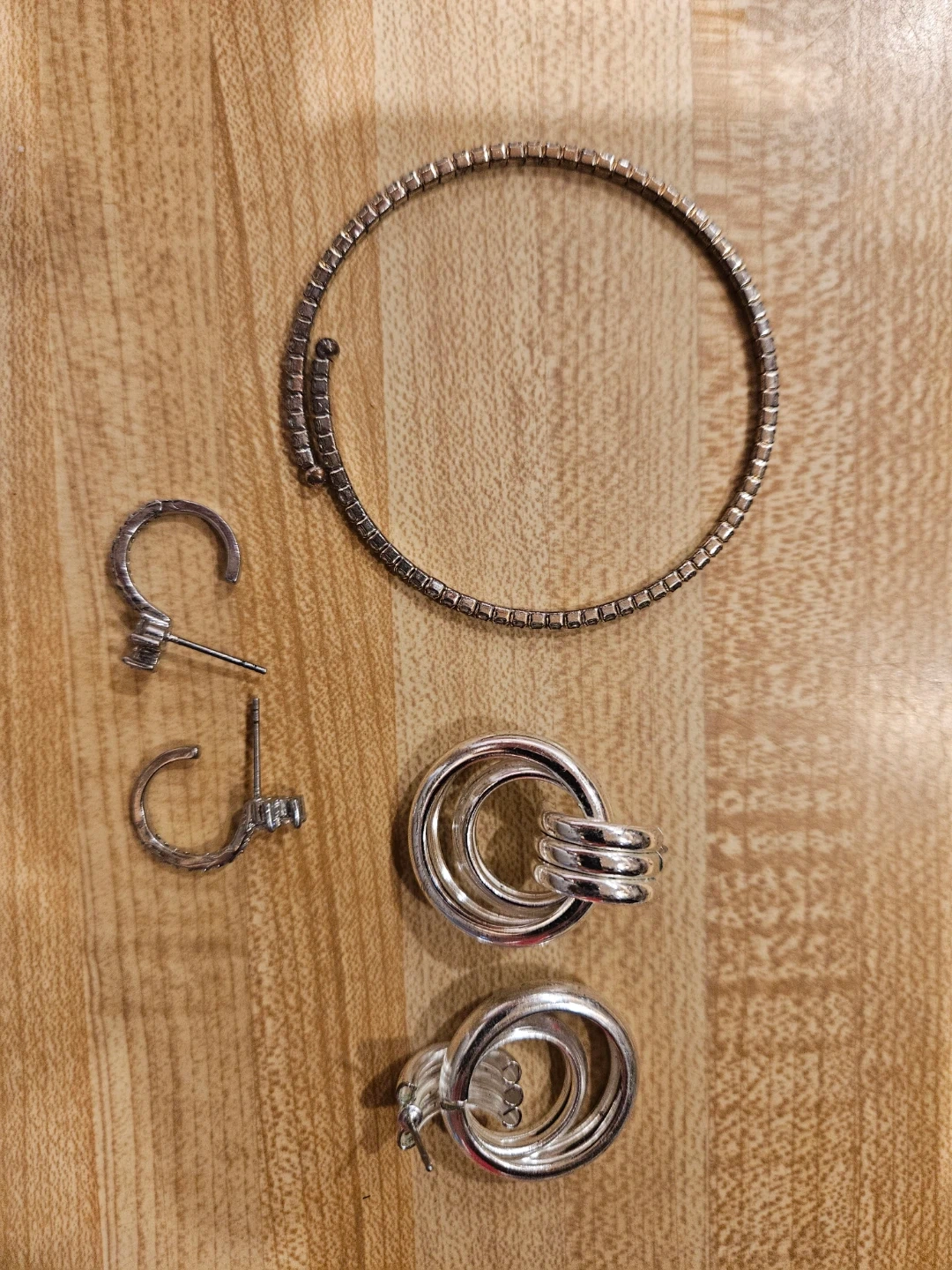 Selling a cute jewelry set! It includes a bracelet, and 2 pair of earrings. All items are silver in color and appear to be in good condition.