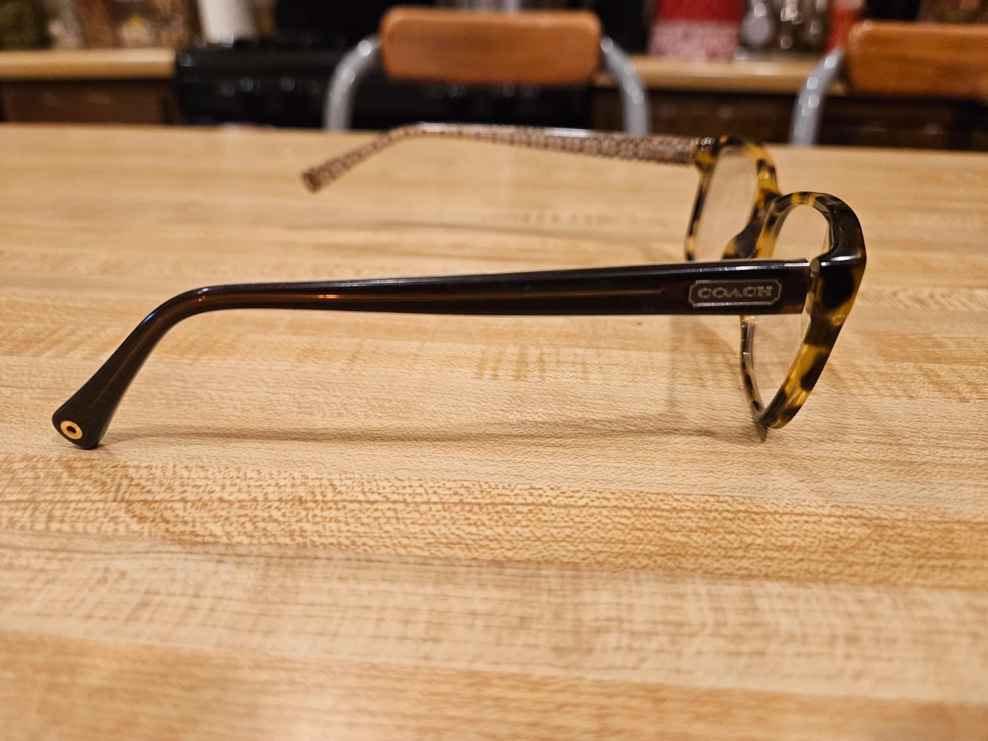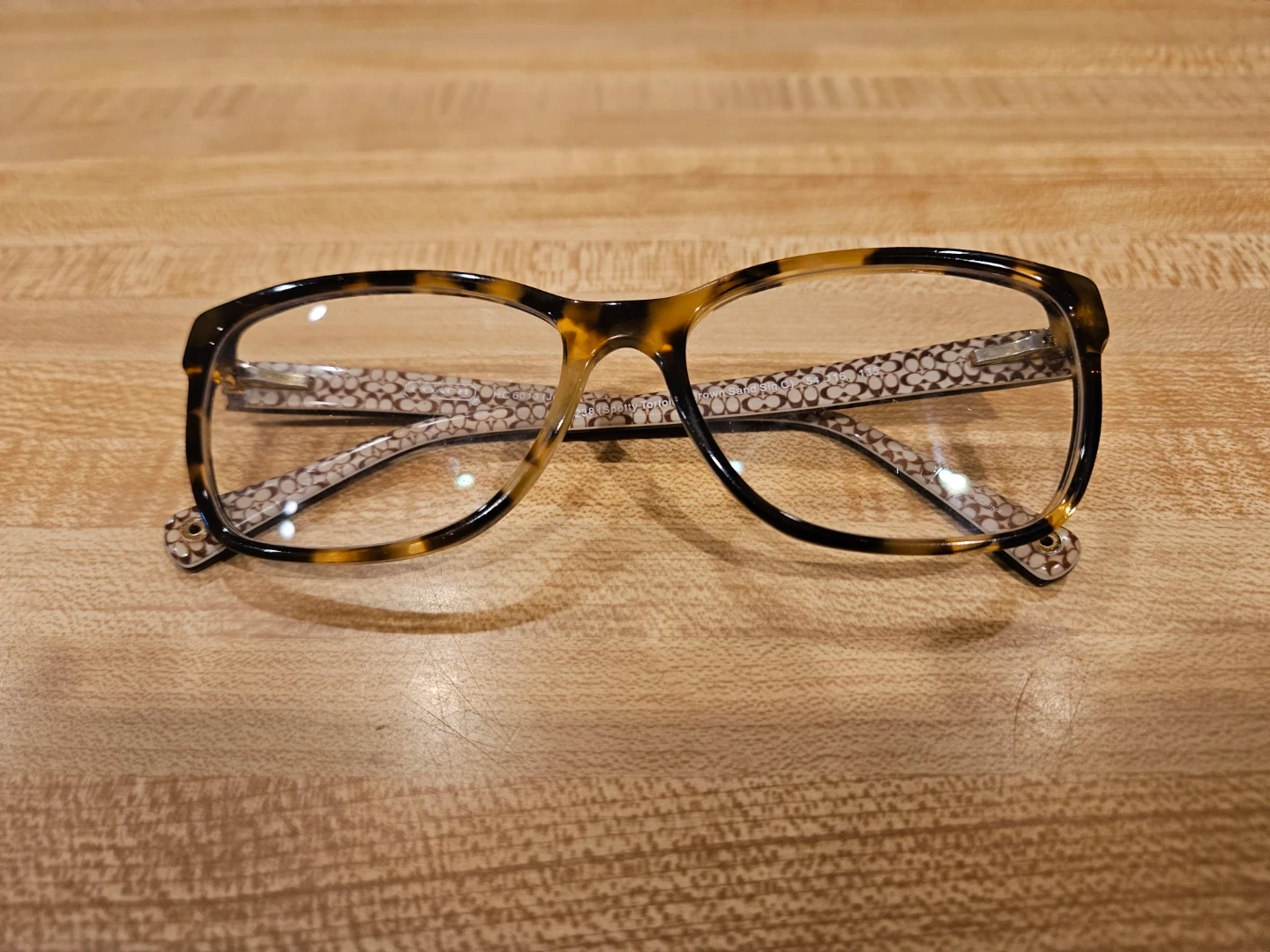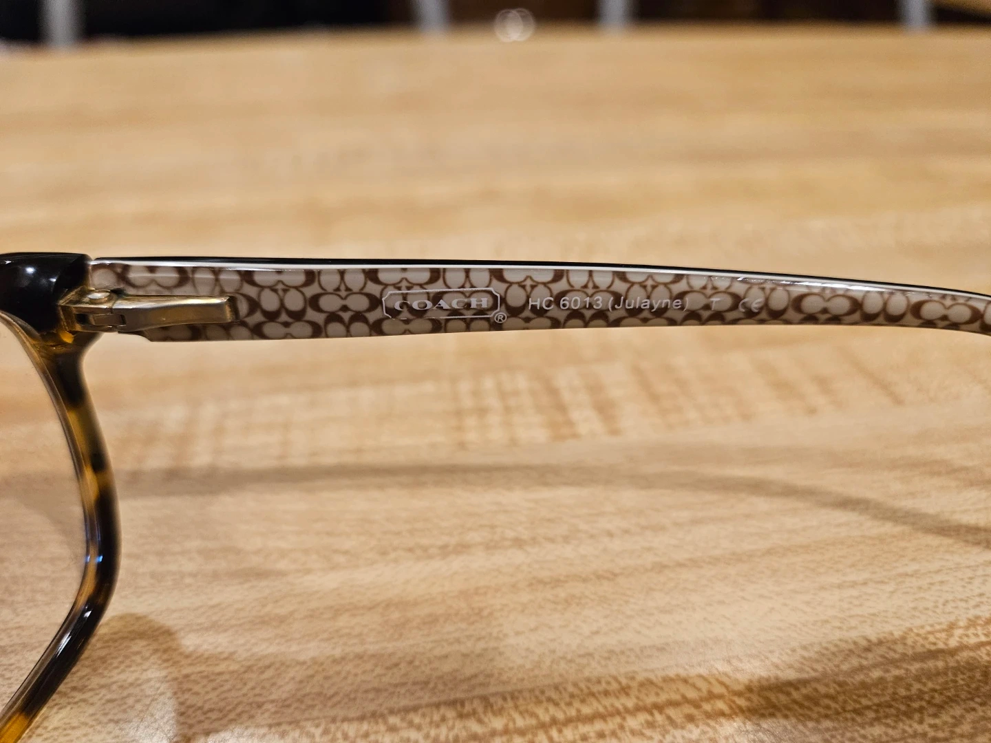 Selling a pair of Coach HC6013 Julayne eyeglasses. They have a tortoise and brown frame with the Coach logo pattern on the arms. They are in good condition and ready for a new owner!