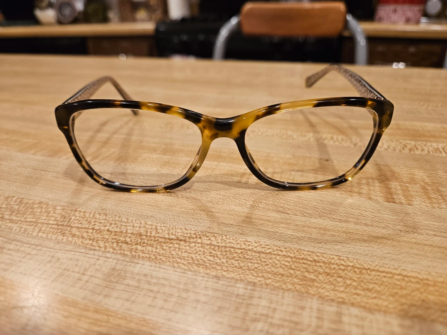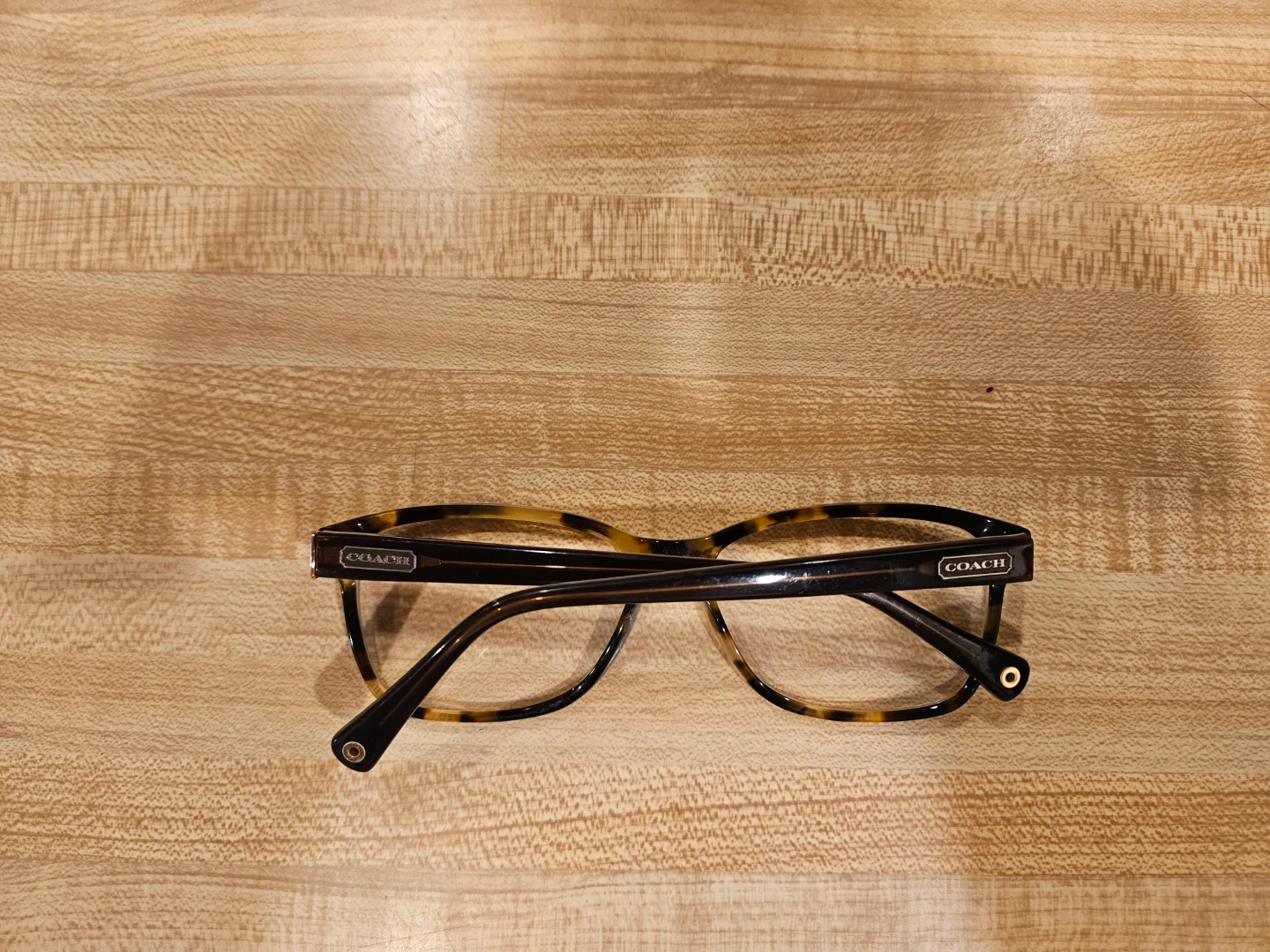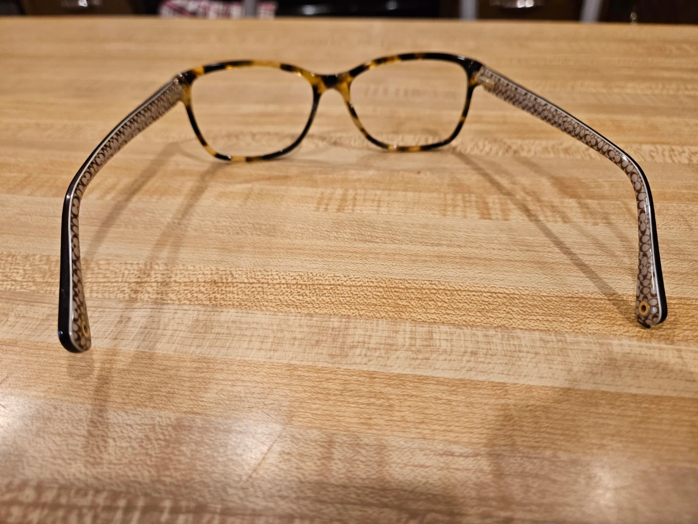 Selling a pair of Coach HC6013 Julayne eyeglasses. They have a tortoise and brown frame with the Coach logo pattern on the arms. They are in good condition and ready for a new owner!