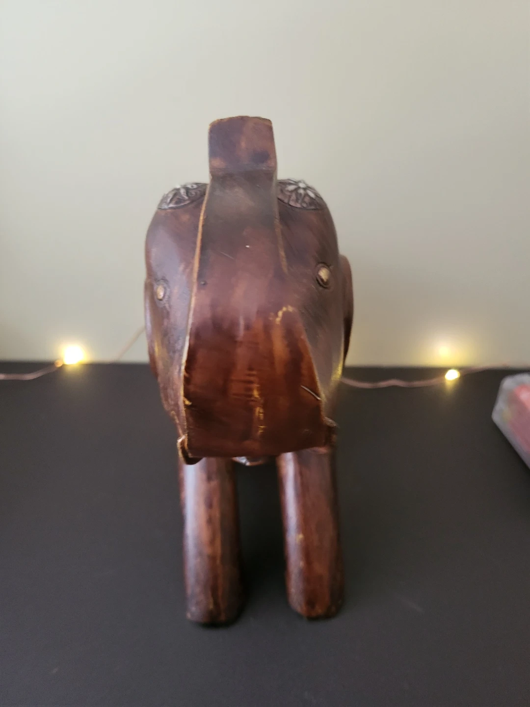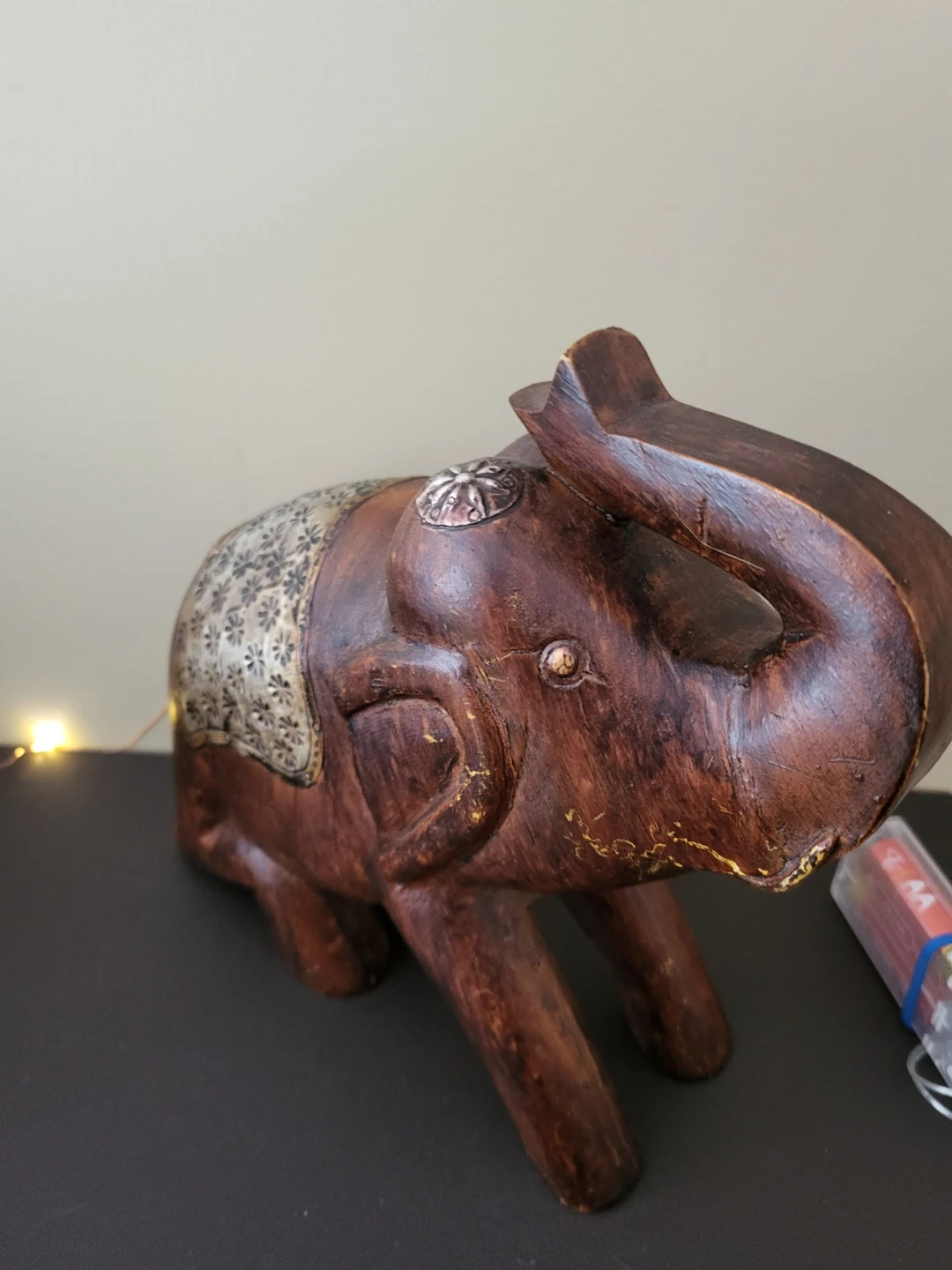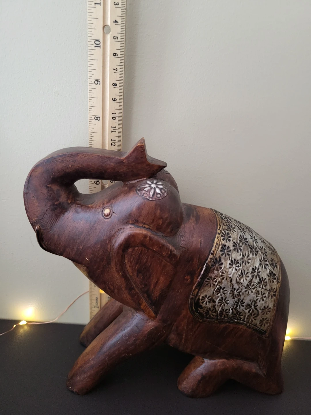 I'm selling a lovely wooden elephant figurine! It has some beautiful detailing and would make a great addition to any room. It measures approximately 10 inches long and 8 inches tall. It's in great condition!