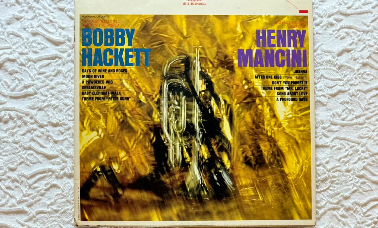 Selling a vinyl record featuring Bobby Hackett and Henry Mancini! The album includes tracks like 'Days of Wine and Roses,' 'Moon River,' and 'Theme from Peter Gunn' by Bobby Hackett, and 'After One Kiss,' 'Theme from Mr. Lucky,' and 'Song About Love' by Henry Mancini.