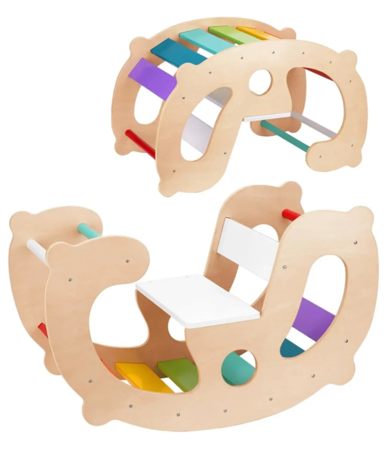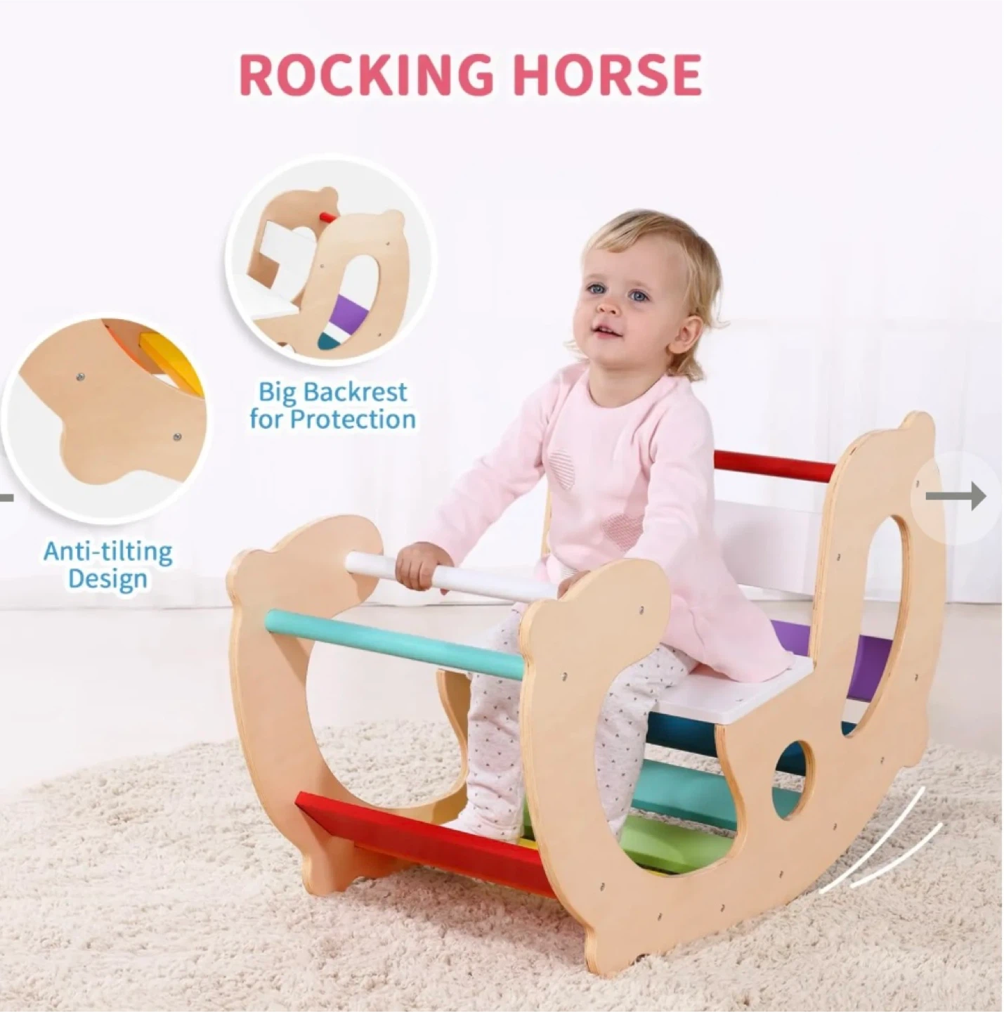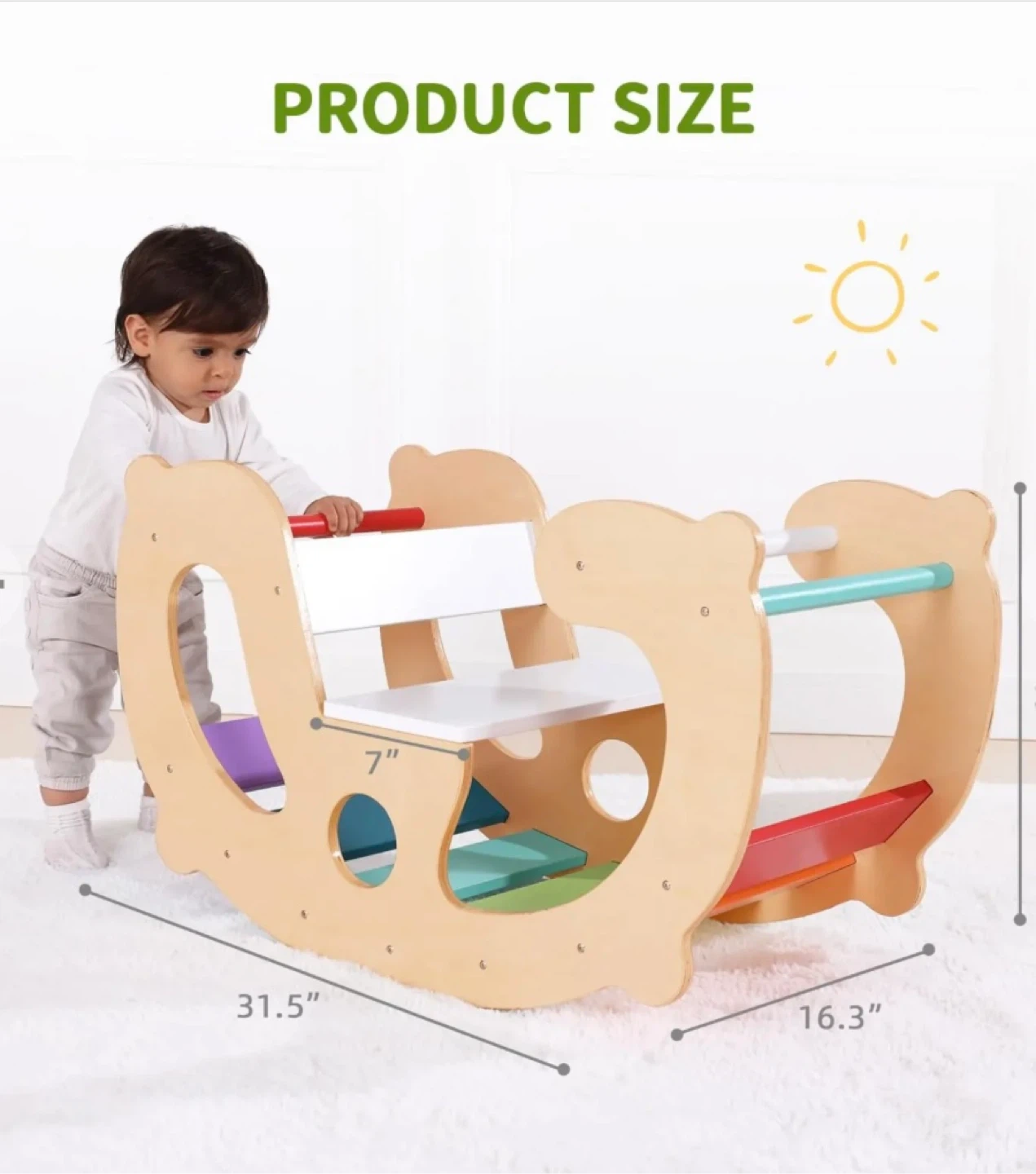 Looking to sell this wooden climber and rocking horse! It's in great shape and ready for a new home. The climber has an anti-tilting design for safety. The rocking horse has a big backrest for protection and is 31.5" in length, 16.3" in width, and 7" in height