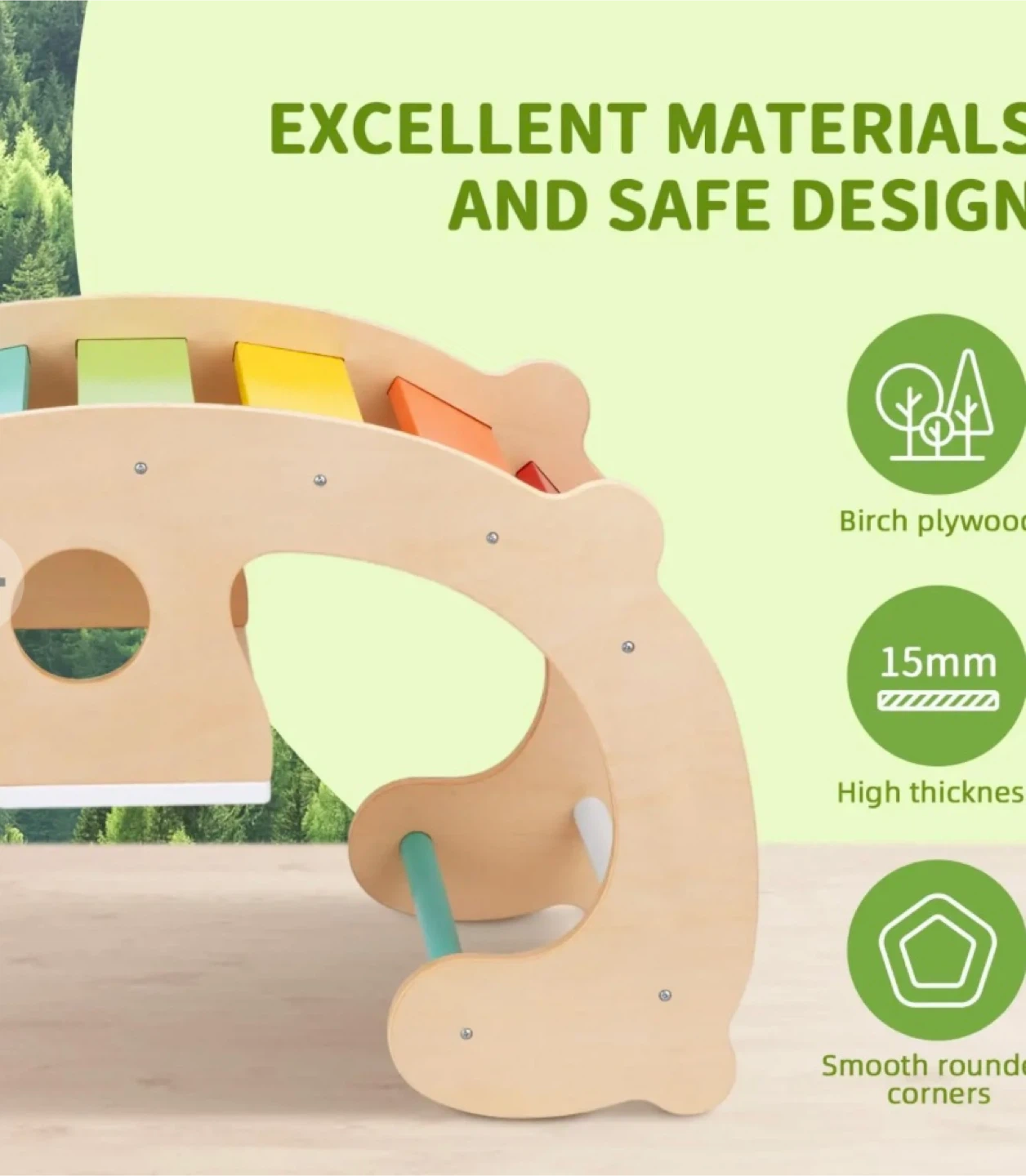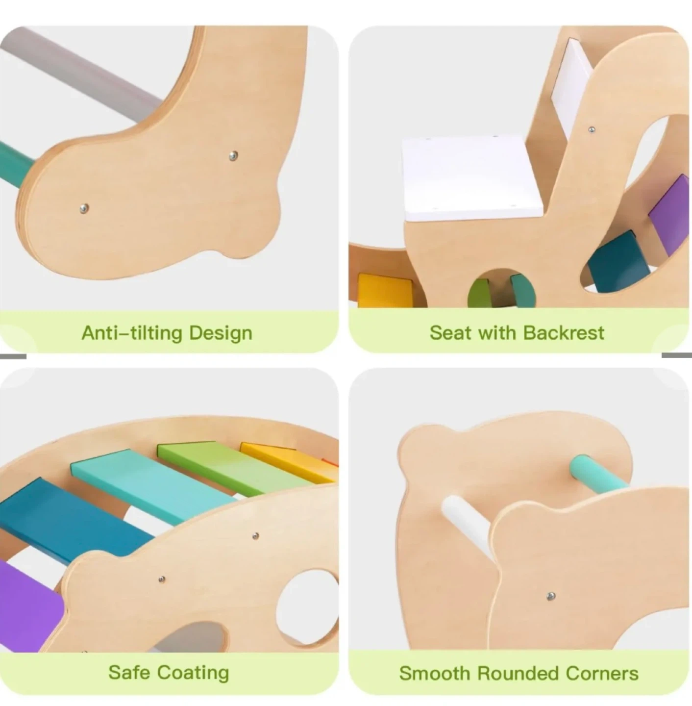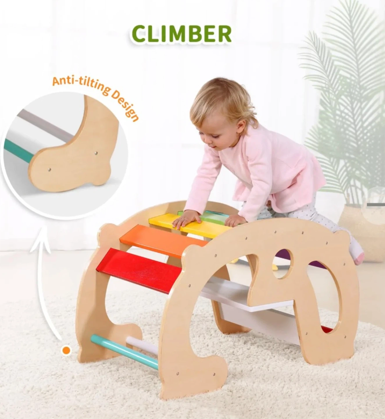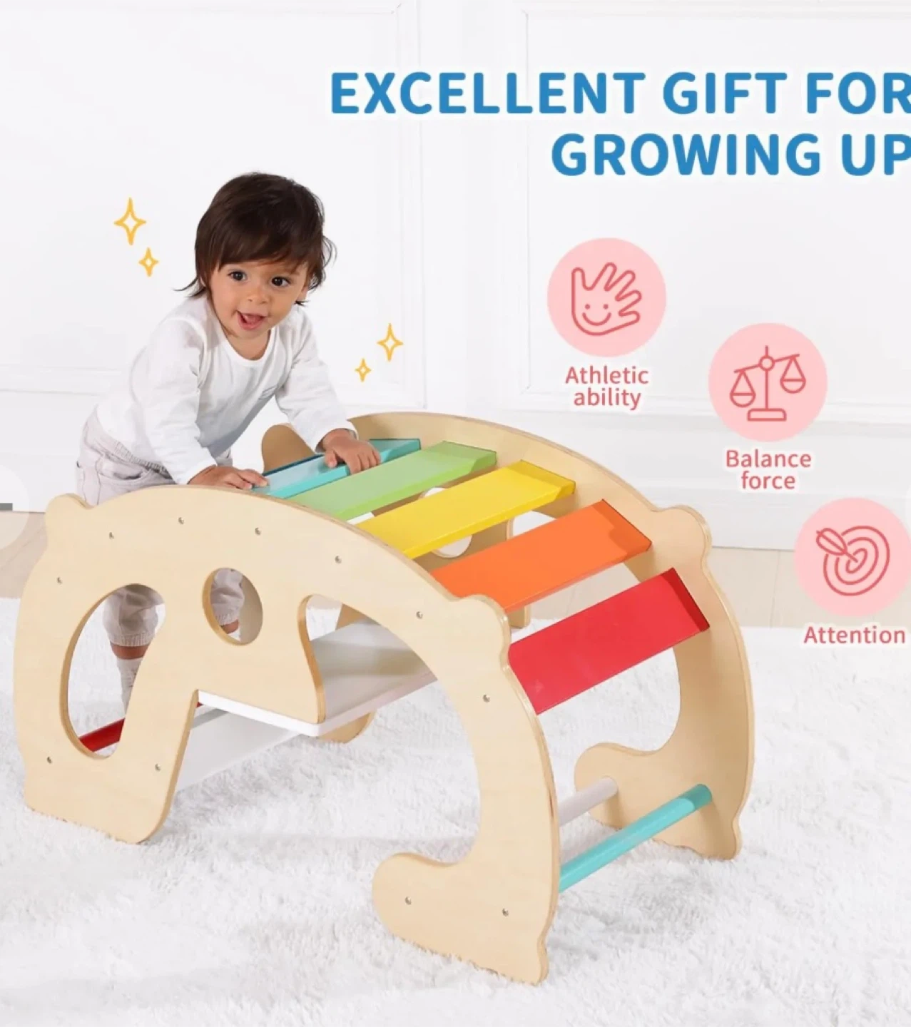 Looking to sell this wooden climber and rocking horse! It's in great shape and ready for a new home. The climber has an anti-tilting design for safety. The rocking horse has a big backrest for protection and is 31.5" in length, 16.3" in width, and 7" in height