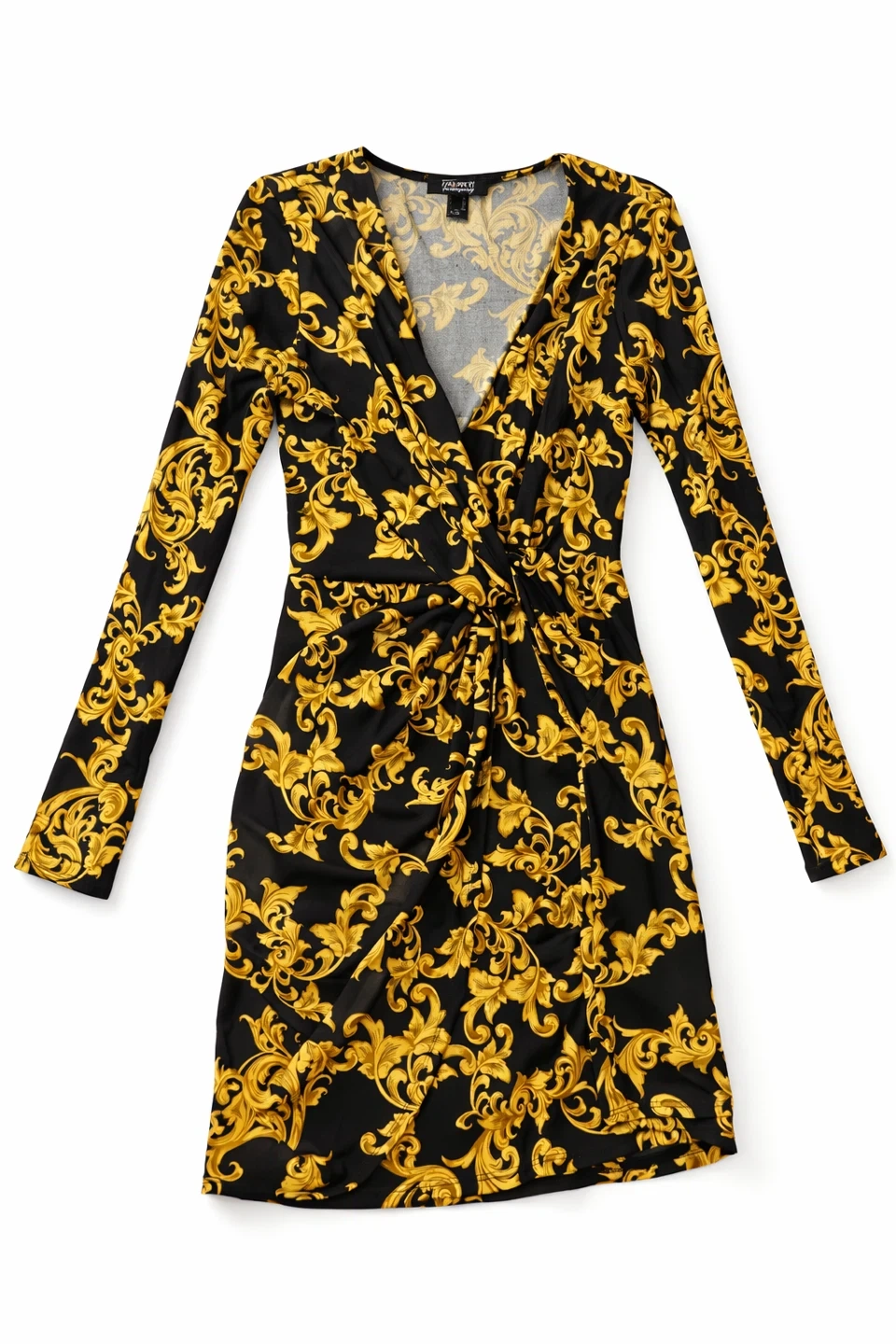 This is a Taboo Fashions dress in size XS.- S. It features a beautiful black and gold baroque pattern. Perfect for a night out or a special occasion!