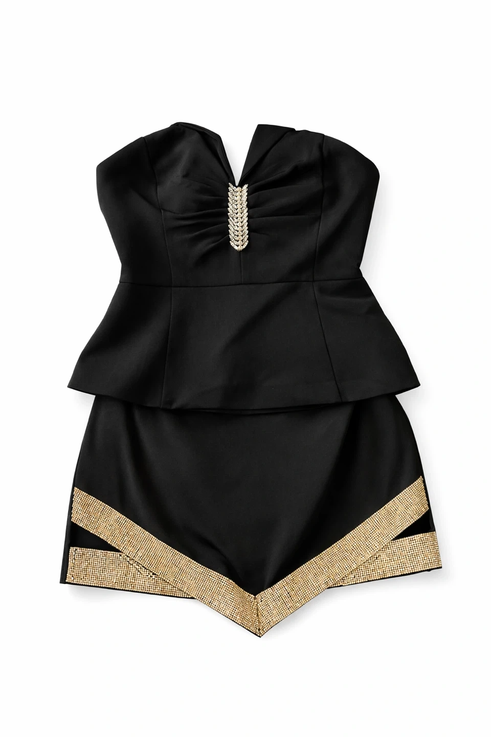 Black Strapless Peplum top and mini skirt with Gold Detail