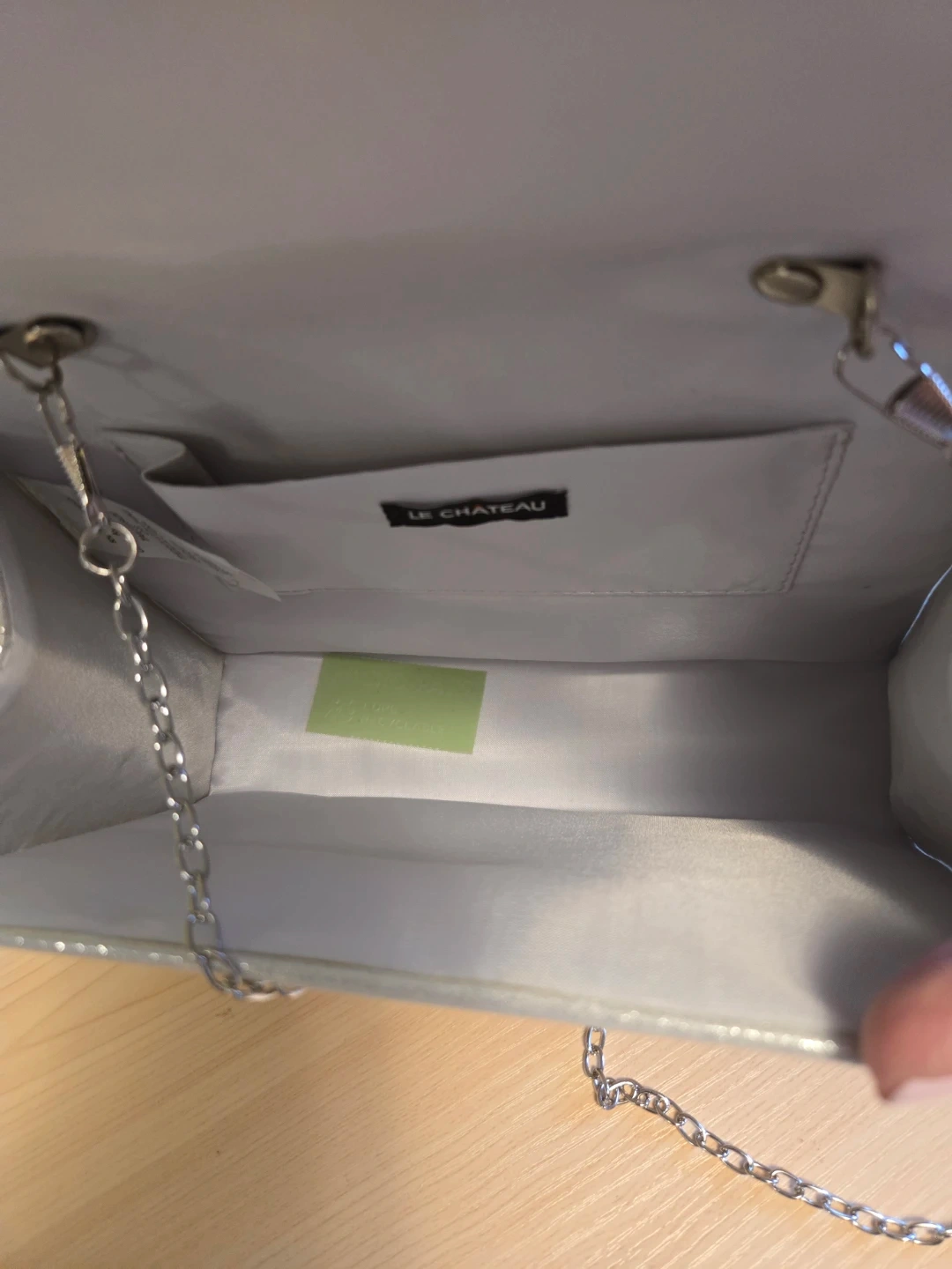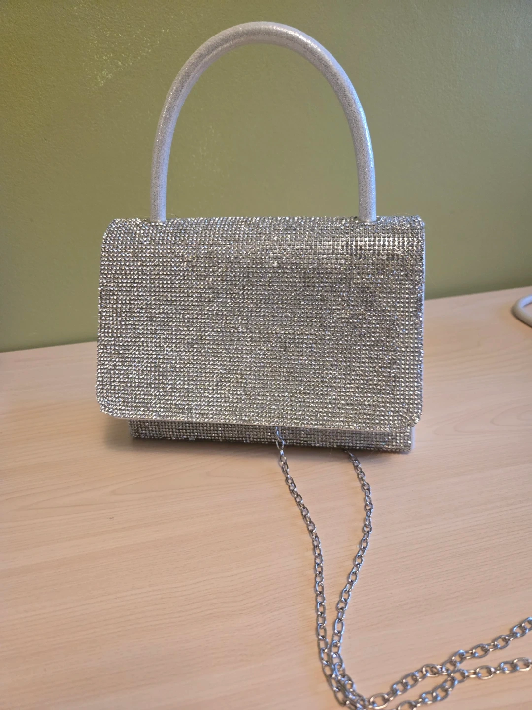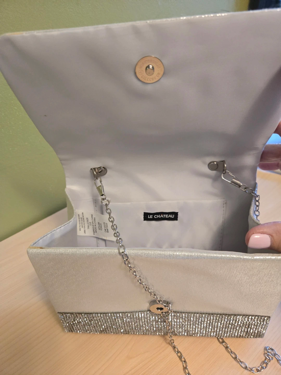 Selling a Le Chateau silver evening bag! It's in great condition and perfect for a night out or special occasion. The bag features a sparkly exterior and a chain strap. Paid $45 plus tax.