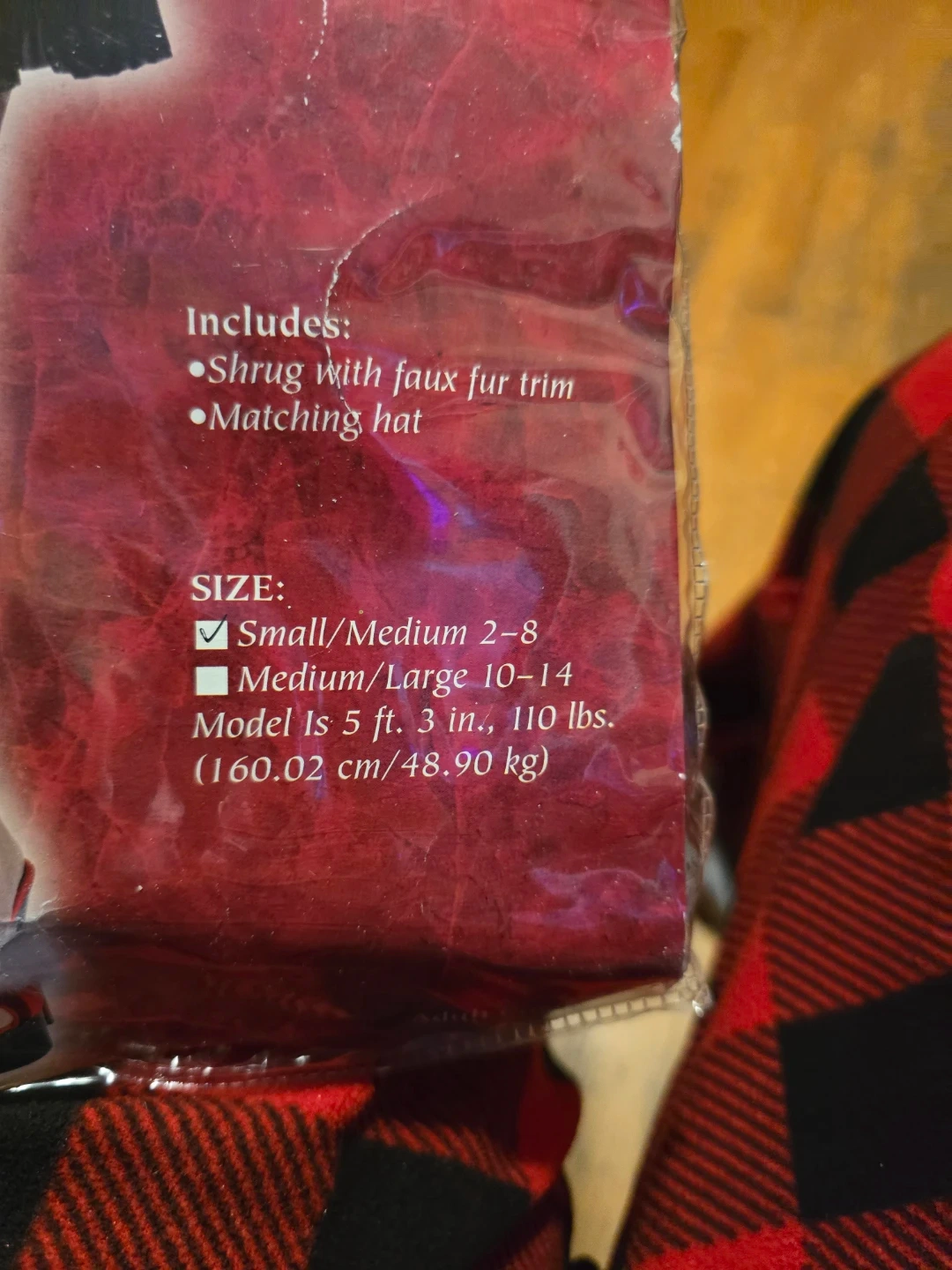 It includes a shrug with faux fur trim and a matching hat. The size is Small/Medium (2-8). Only used once, and is in perfect condition for the following Christmas.