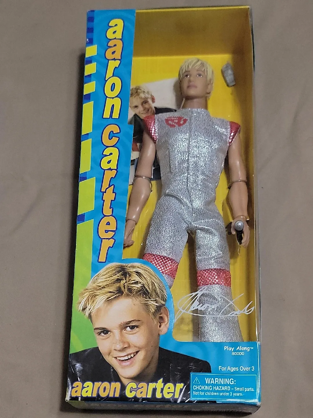 Selling an Aaron Carter doll by Play Along, model number 80000. It's designed for ages over 3. The packaging includes a warning about a choking hazard due to small parts.