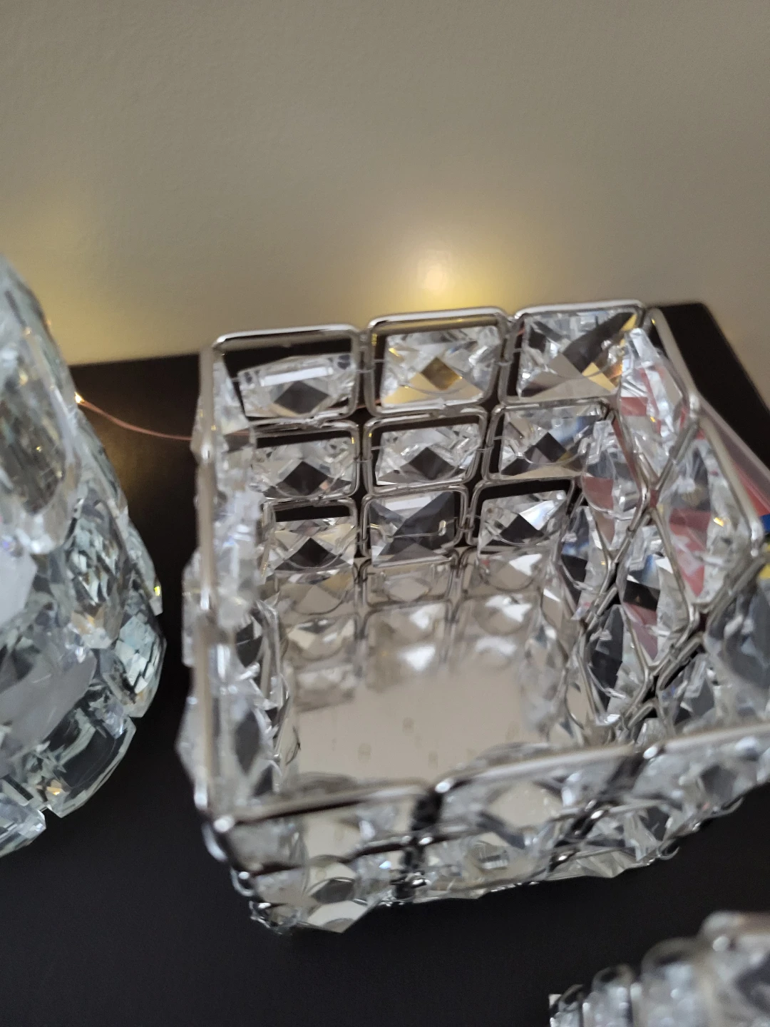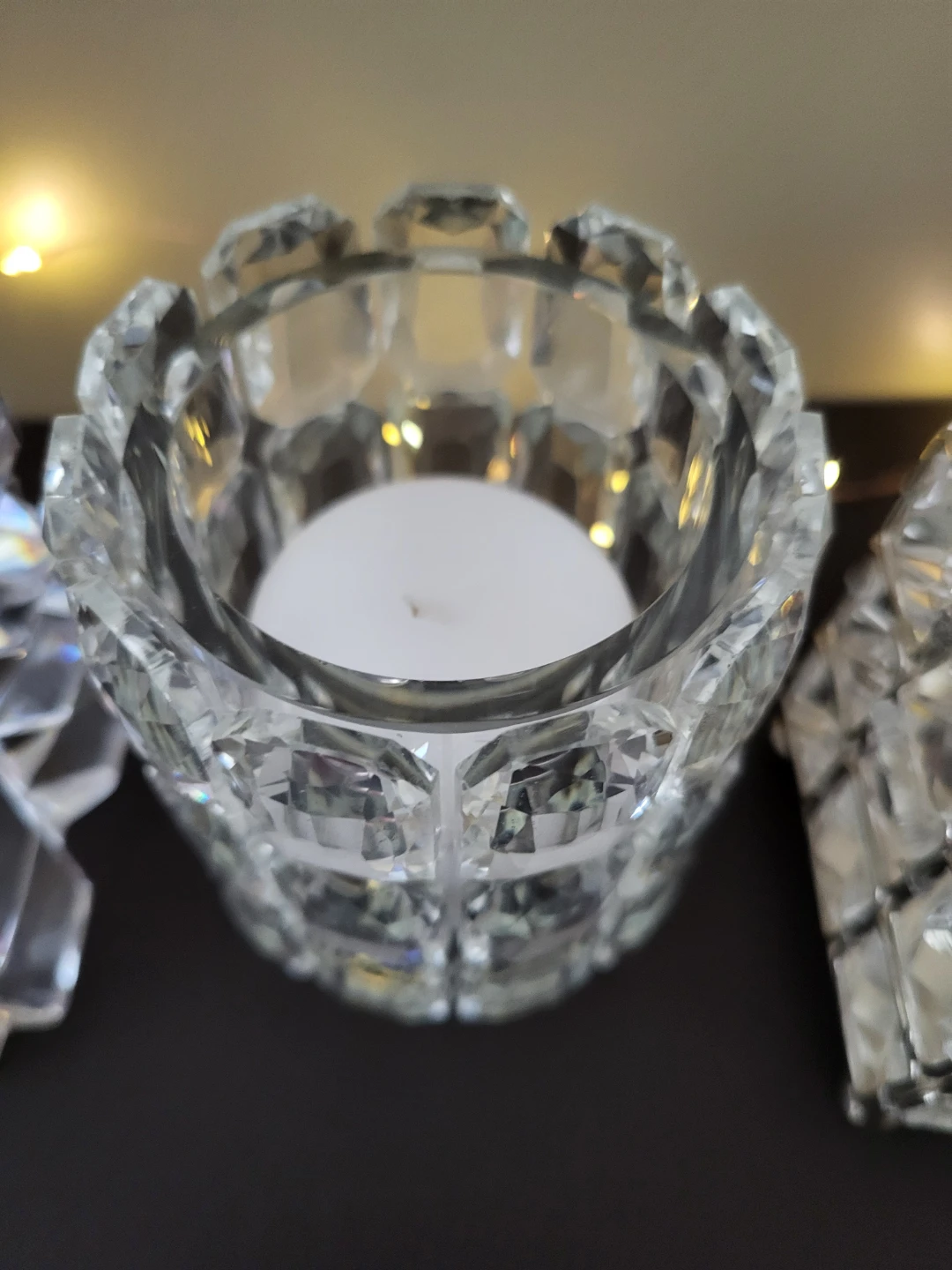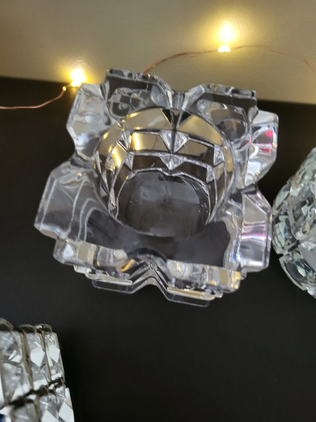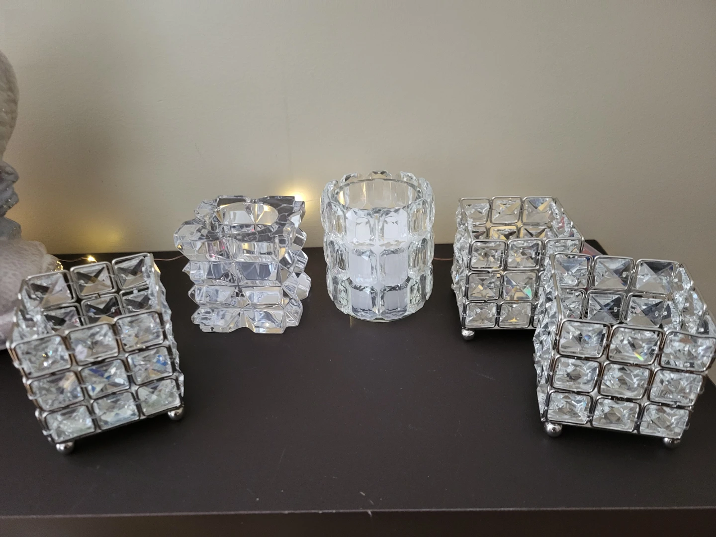 Selling a set of 5 crystal candle holders! They're perfect for adding a touch of sparkle to any room. They are in great condition and ready to brighten up your space