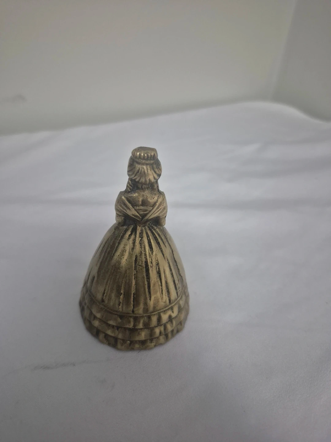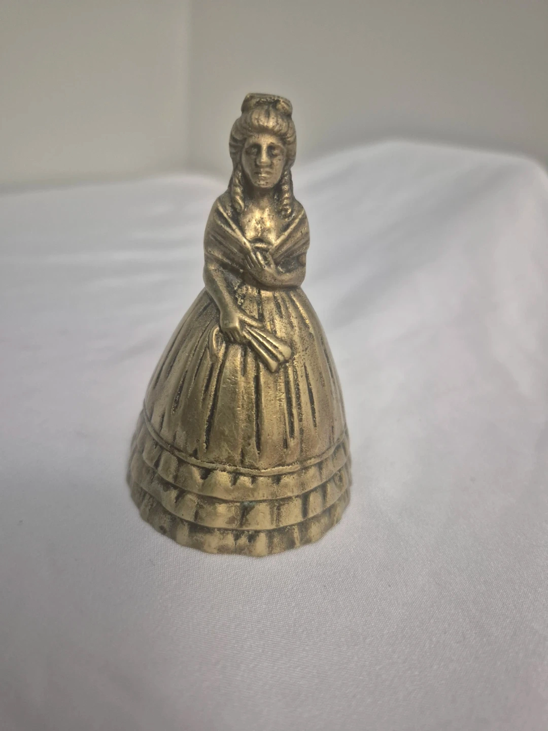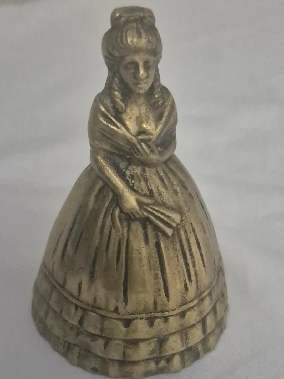 Selling a vintage brass bell in the shape of a lady figurine. It's a unique and charming piece, perfect for collectors or anyone who appreciates vintage decor. The bell is made of brass and has a lovely patina, giving it a classic look dated back to the 1910s