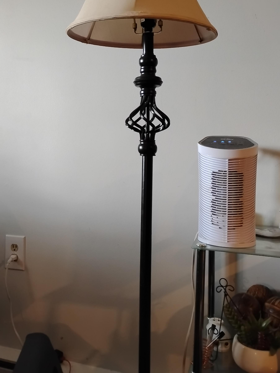 Selling a floor lamp with a black finish. It has a nice design in the middle of the stand. The shade is a light beige colour.