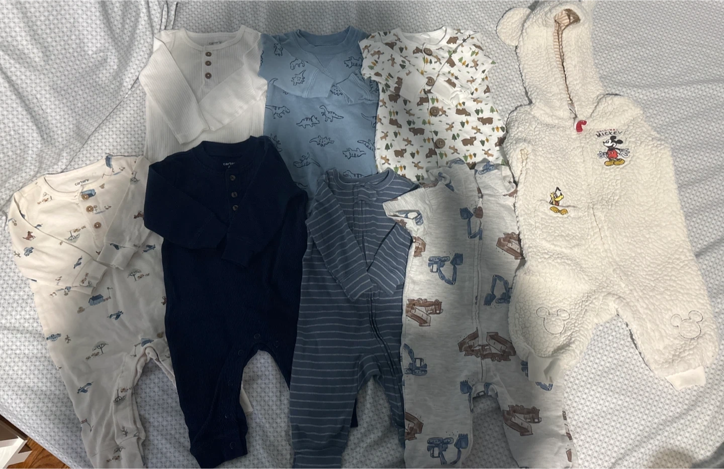 Selling a bundle of baby onesies and a romper from Carter's! They're all in great condition and ready for a new little one. Perfect for layering or comfy playtime
