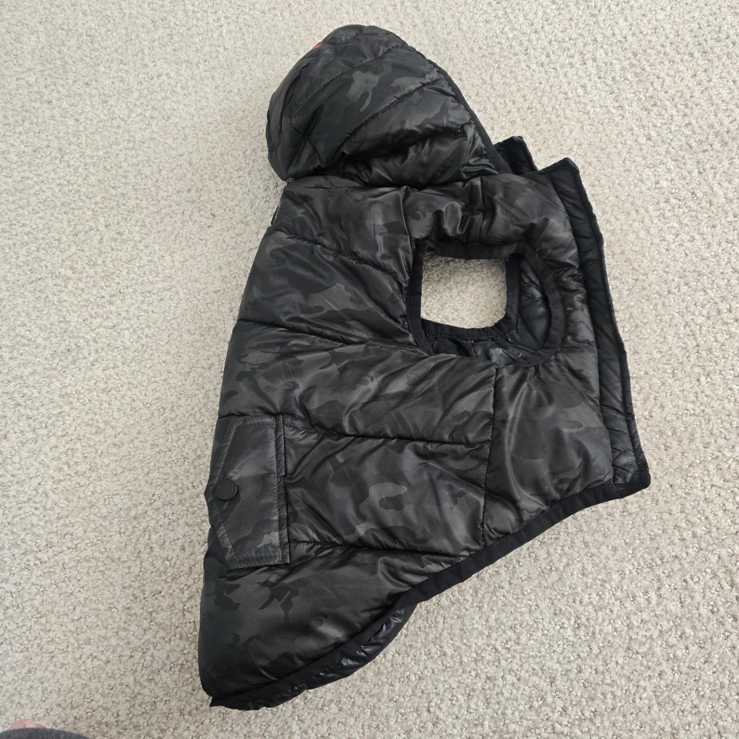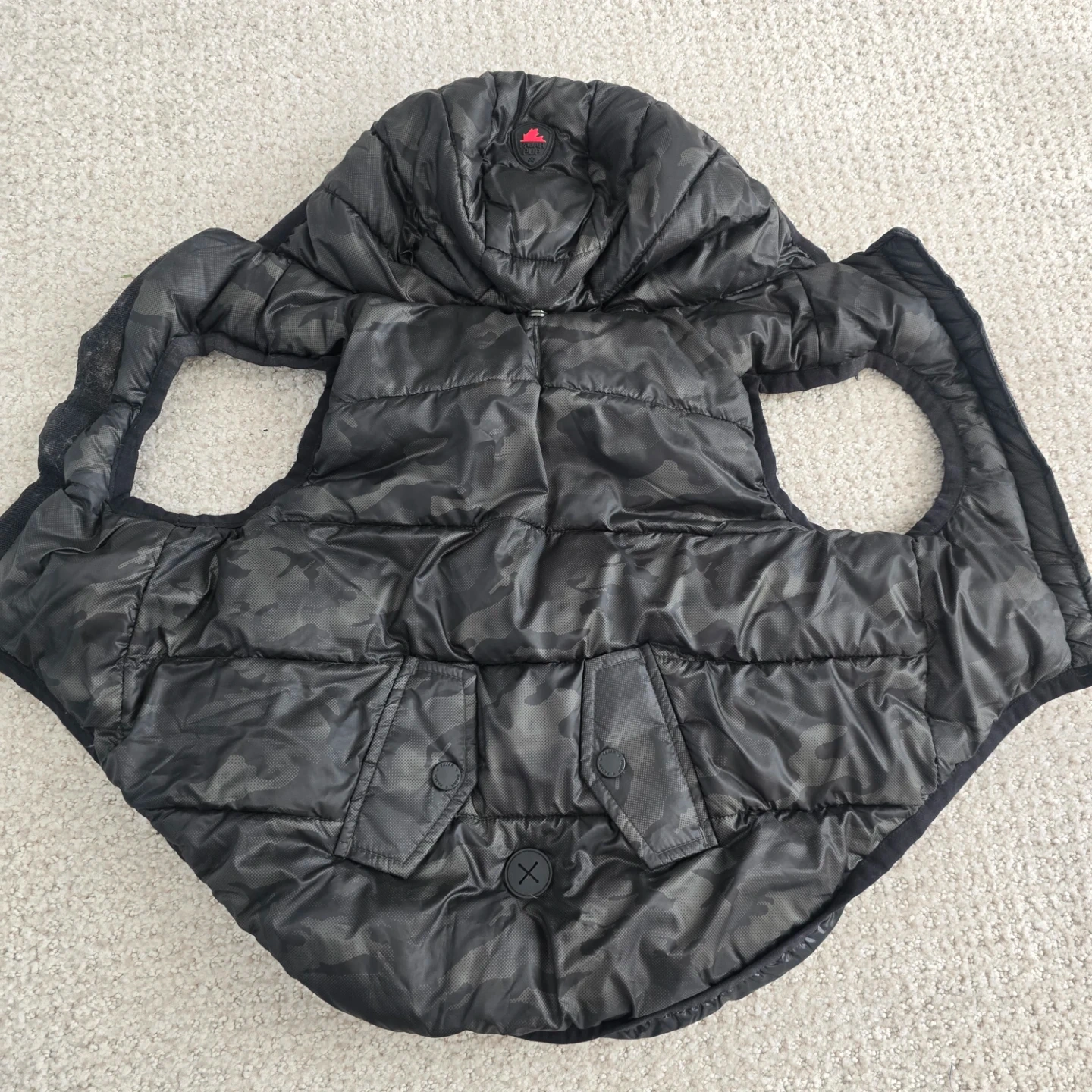 Keep your furry friend warm with this Pajar Pup dog puffer vest! It has a stylish camo pattern on one side and a sleek black finish on the other. Perfect for those chilly Canadian walks!