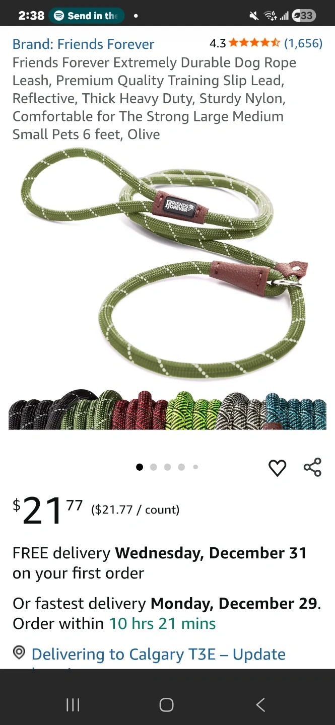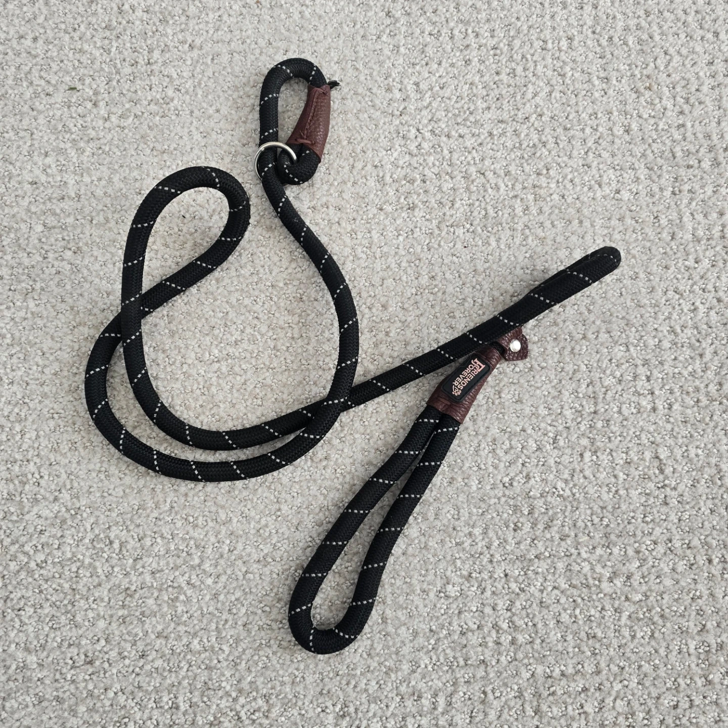 Selling a Friends Forever dog rope leash. It's an extremely durable, premium quality training slip lead. It's reflective, thick, heavy duty, and sturdy. Made of nylon and comfortable for strong, large, medium, and small pets. It's 6 feet long and comes in olive.