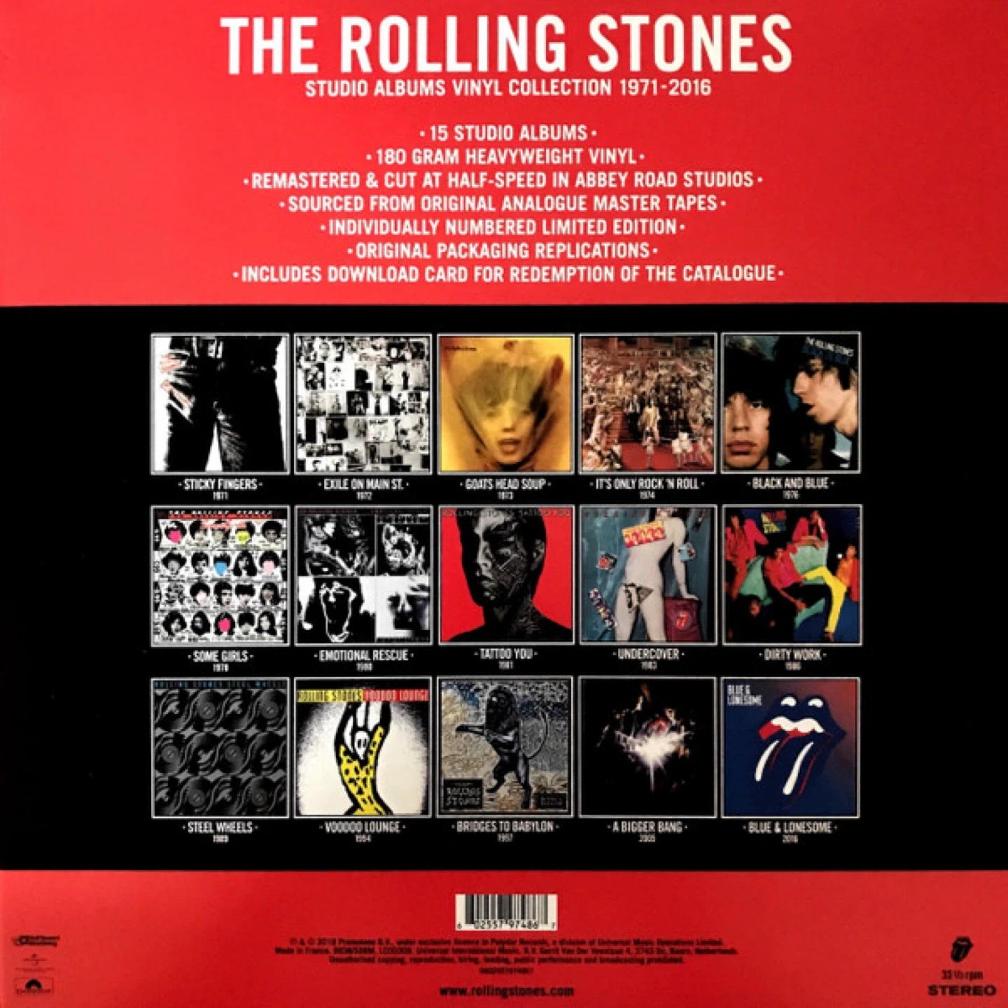 Selling The Rolling Stones Studio Albums Vinyl Collection 1971-2016. Opened and played once, kept in immaculate condition. This set includes 15 studio albums, remastered and cut at half-speed in Abbey Road Studios. The vinyl is 180 gram heavyweight. Sourced from original analogue master tapes, it's an individually numbered limited edition with original packaging replications. It also includes a download card for redemption of the catalogue.