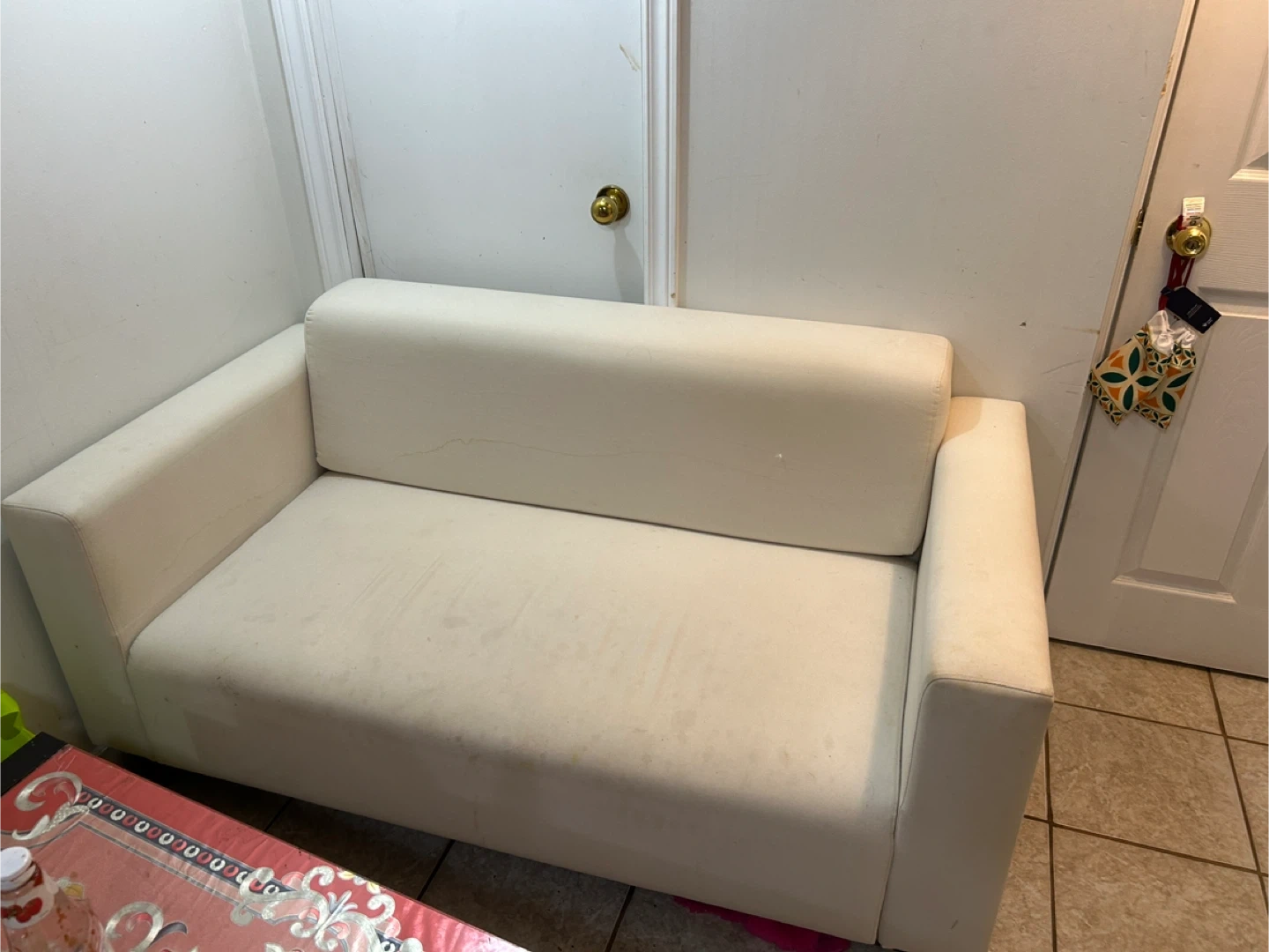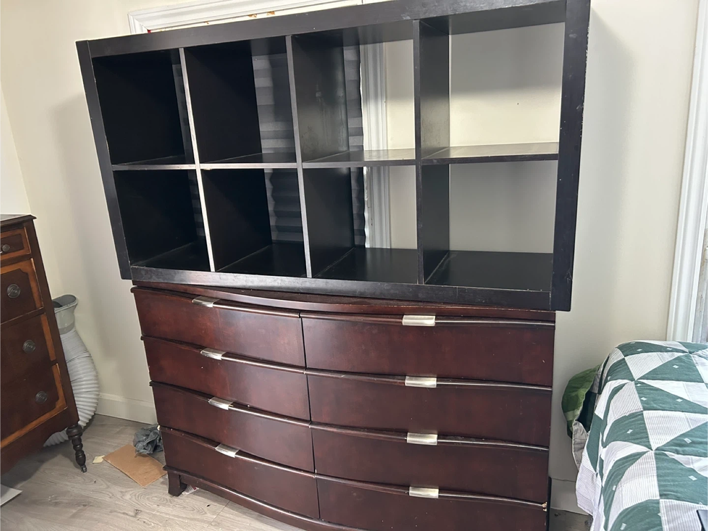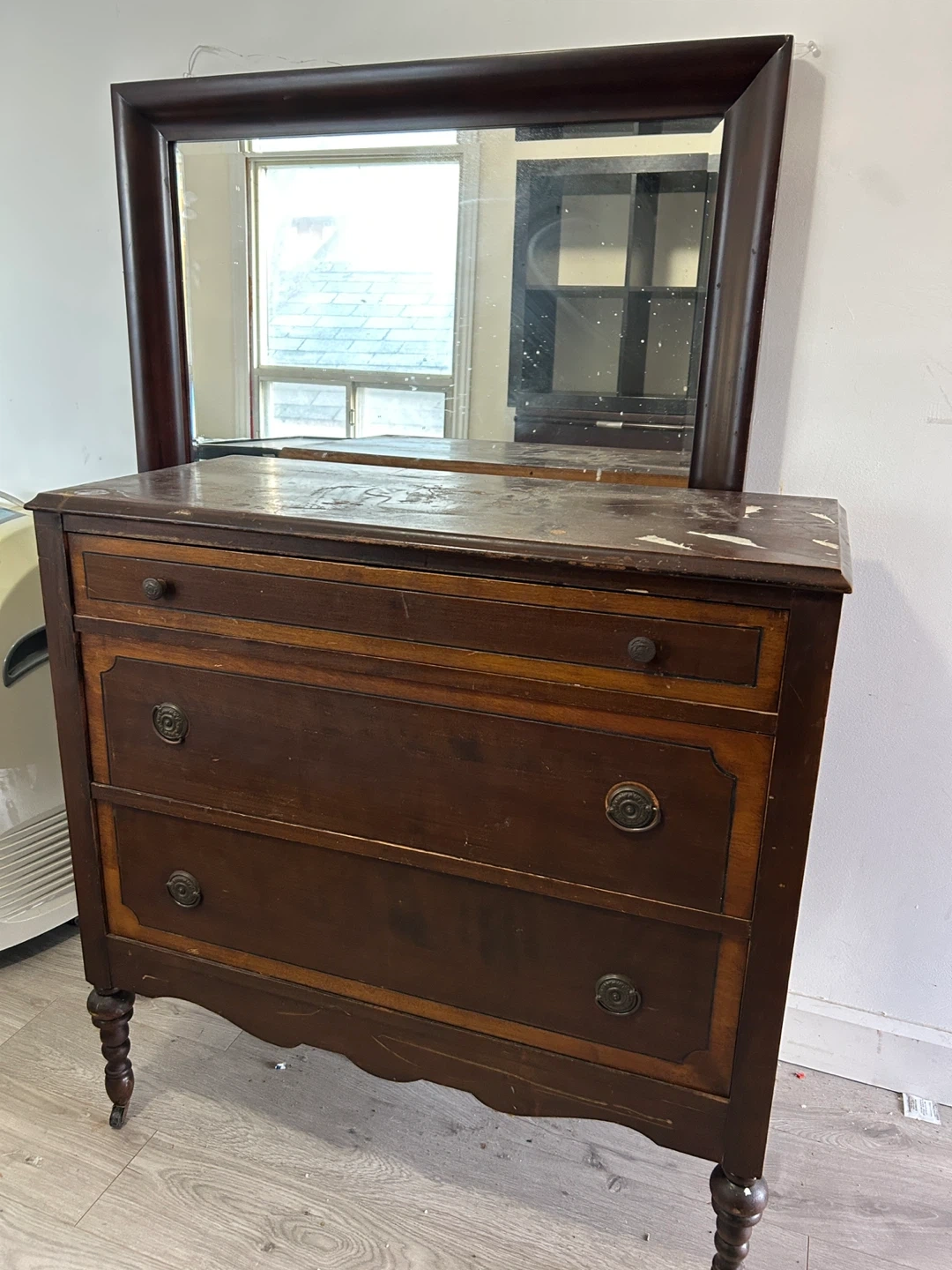 I'm selling a variety of used furniture pieces. There's a white loveseat, a brown cushion, a wooden dresser with four drawers, a black shelving unit, and a dresser with a mirror. They show some signs of use, but could be a great addition to your home!