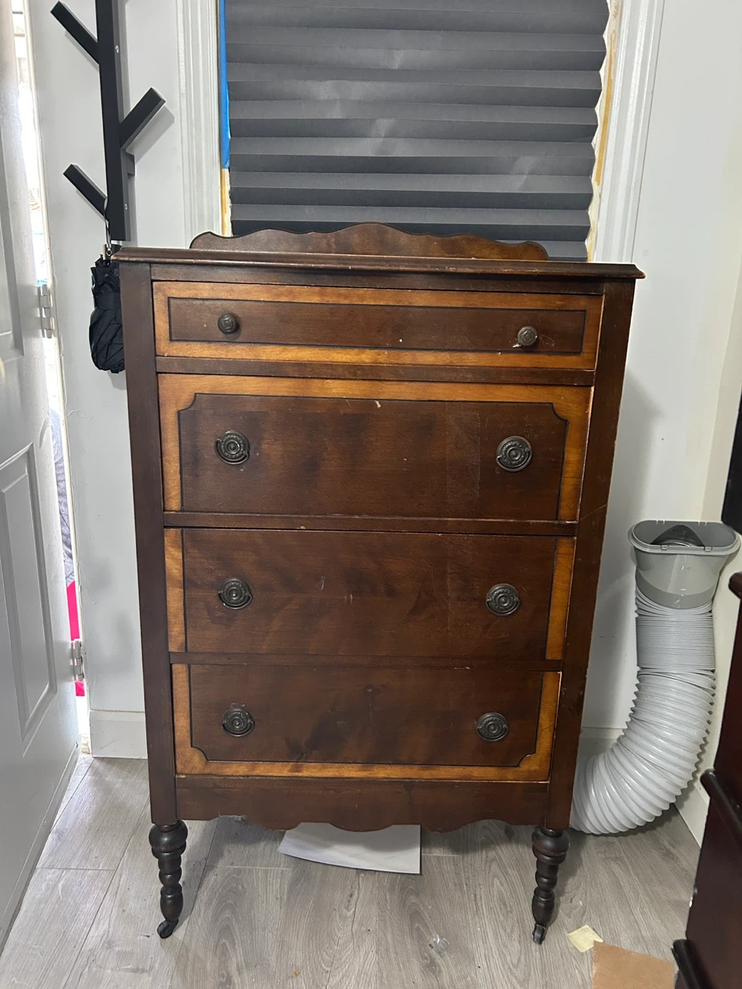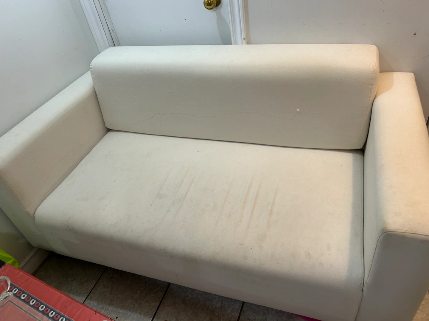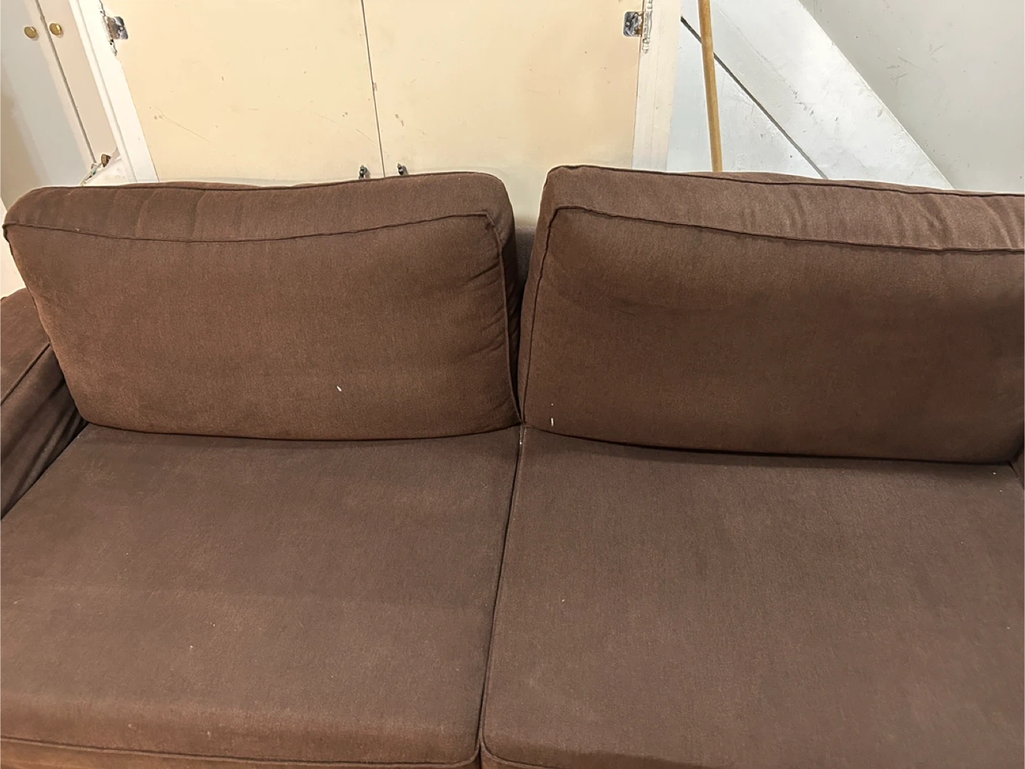 I'm selling a variety of used furniture pieces. There's a white loveseat, a brown cushion, a wooden dresser with four drawers, a black shelving unit, and a dresser with a mirror. They show some signs of use, but could be a great addition to your home!